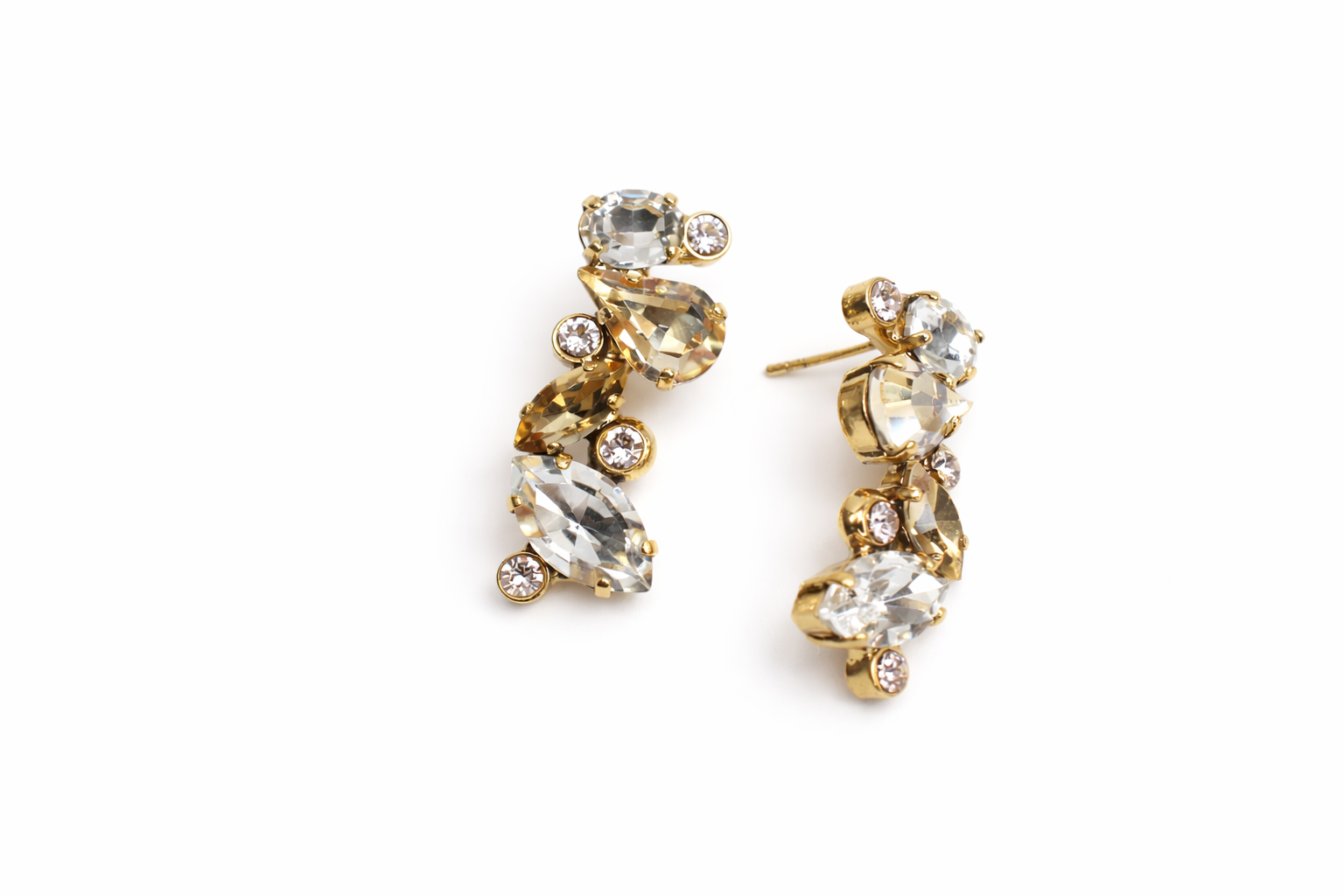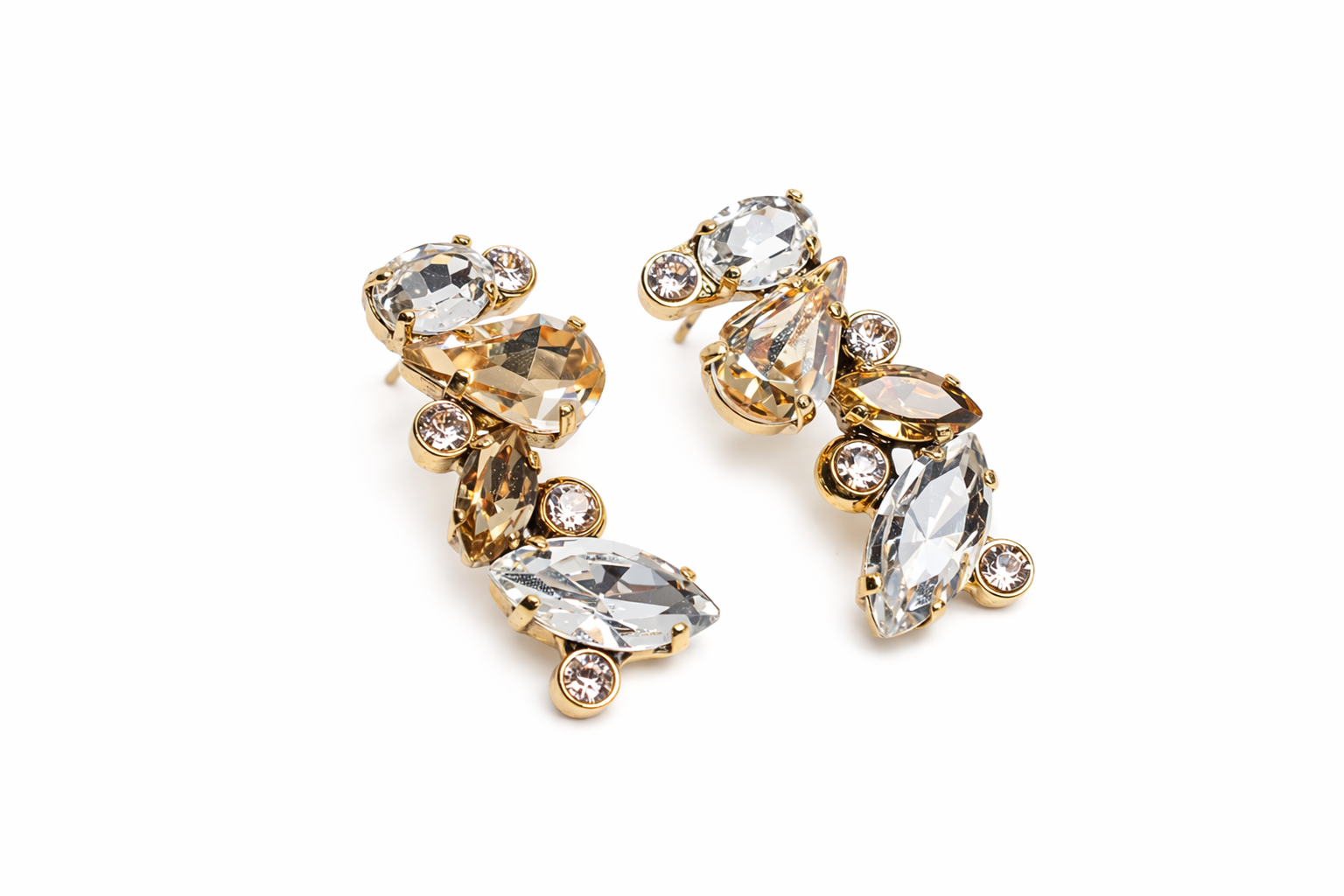 An elegant composition of mixed-cut Swarovski crystals, these earrings feature a sculptural arrangement of marquise, oval, and pear-shaped stones. The palette blends clear and champagne-toned crystals, creating a warm, luminous effect that catches the light from every angle.