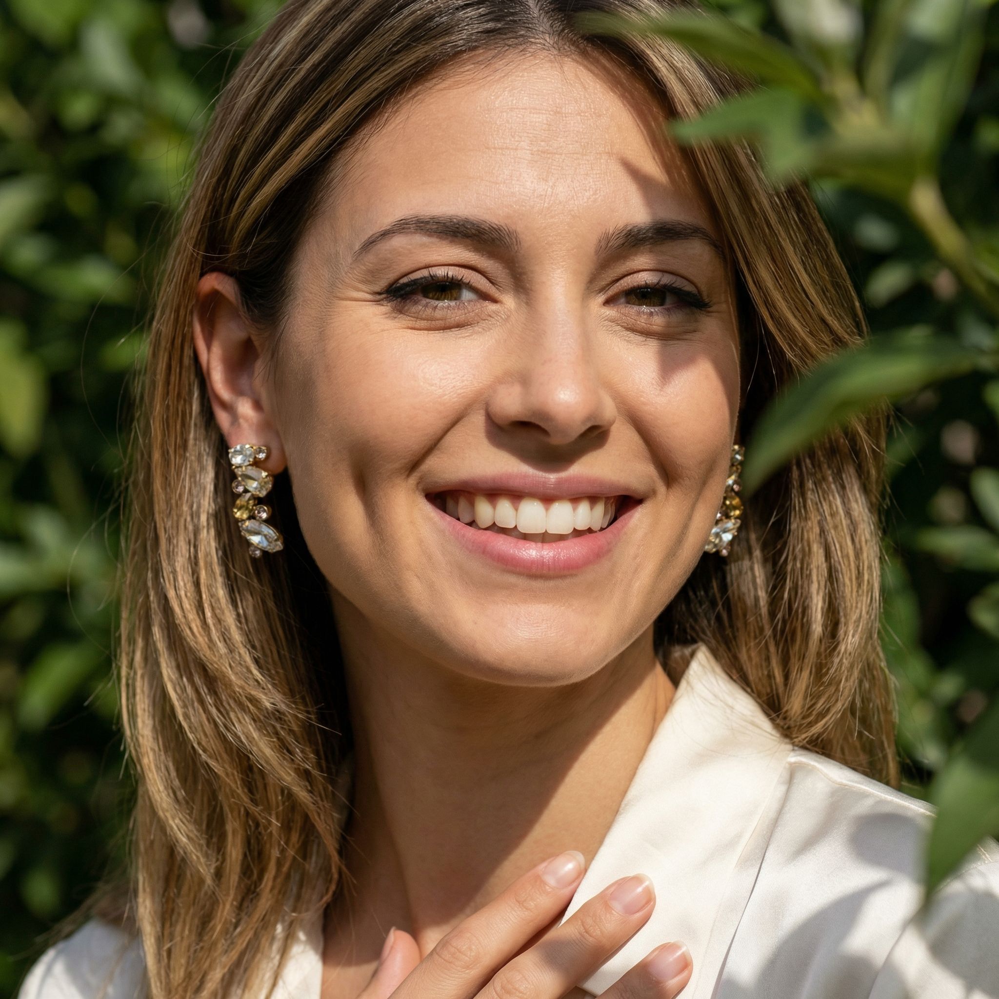 NOUR elegant composition of mixed-cut Swarovski crystals, these earrings feature a sculptural arrangement of marquise, oval, and pear-shaped stones. The palette blends clear and champagne-toned crystals, creating a warm, luminous effect that catches the light from every angle.