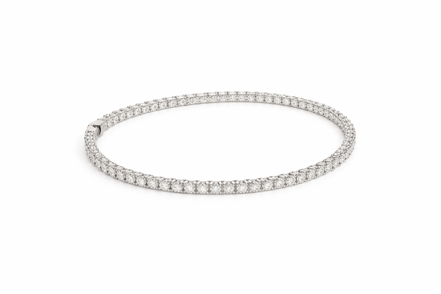 This classic tennis bracelet exudes timeless elegance, featuring a continuous line of closely set round brilliant-cut stones that create a seamless band of sparkle. Each stone is individually secured in a refined setting, allowing maximum light to pass through and enhance the brilliance and fire of the piece.