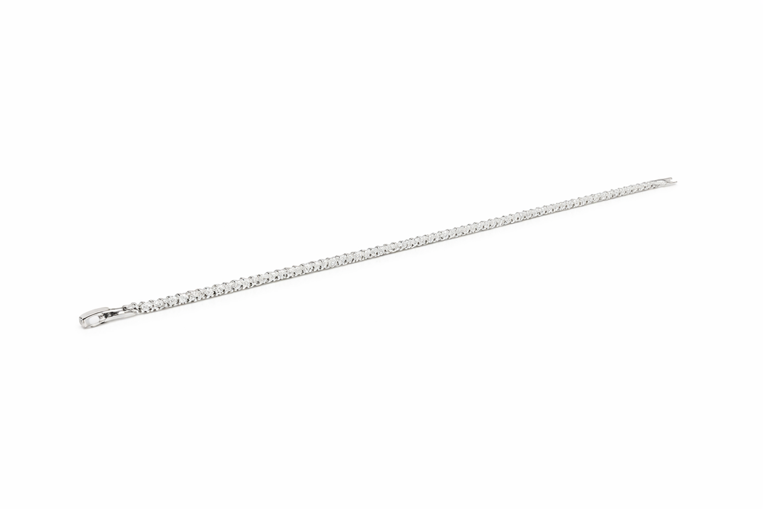 Crafted in a sleek white metal—likely white gold or platinum—the bracelet has a clean, polished finish that complements the clarity of the stones. Its flexible construction ensures a comfortable fit around the wrist, while the discreet clasp provides both security and a smooth, uninterrupted appearance.