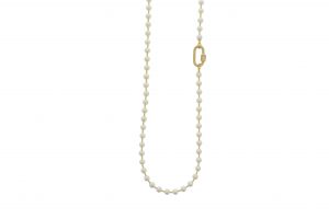The necklace’s innovative design allows for flexible styling, whether worn long for a chic and effortless look, or doubled up for a more dynamic and layered appearance. Adding a touch of whimsy and sparkle, the multicolor pave screw lock clasp serves as a stunning focal point, elevating the necklace’s allure with its vibrant hues.