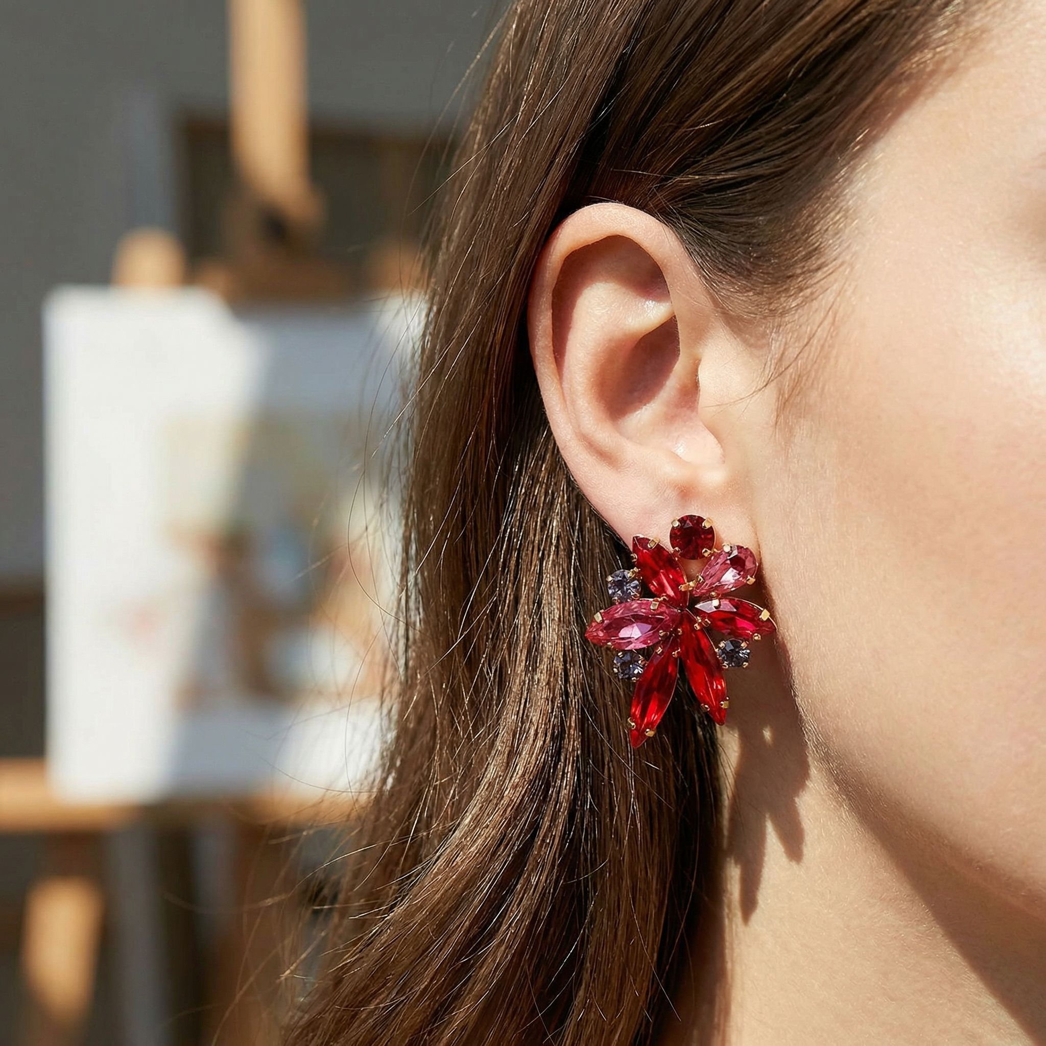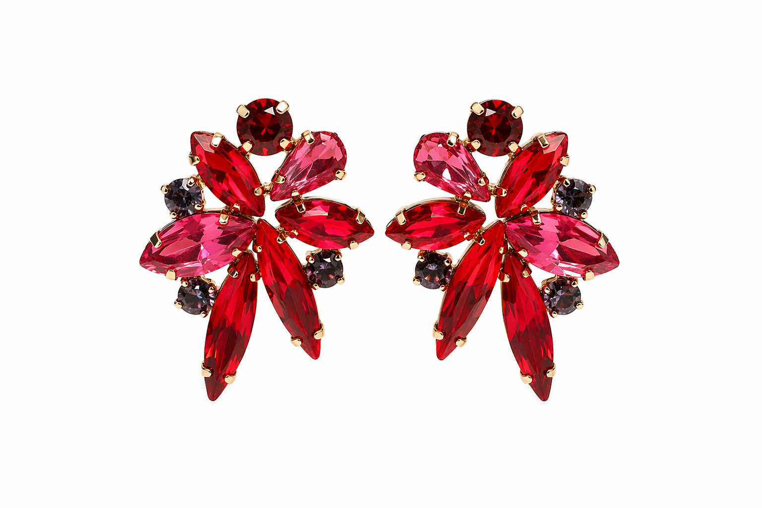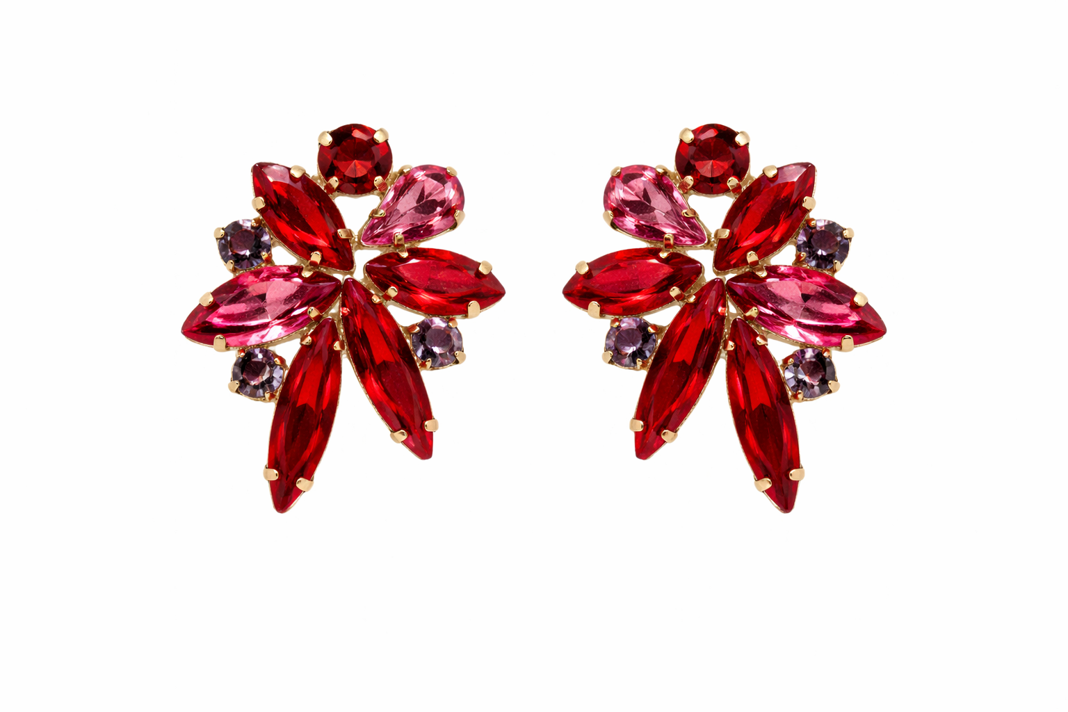A bold and eye-catching pair of statement earrings, designed in a striking floral silhouette. Featuring a mix of faceted marquise and round-cut crystals in rich red and soft pink tones, accented with subtle deeper hues, this pair captures light beautifully from every angle.