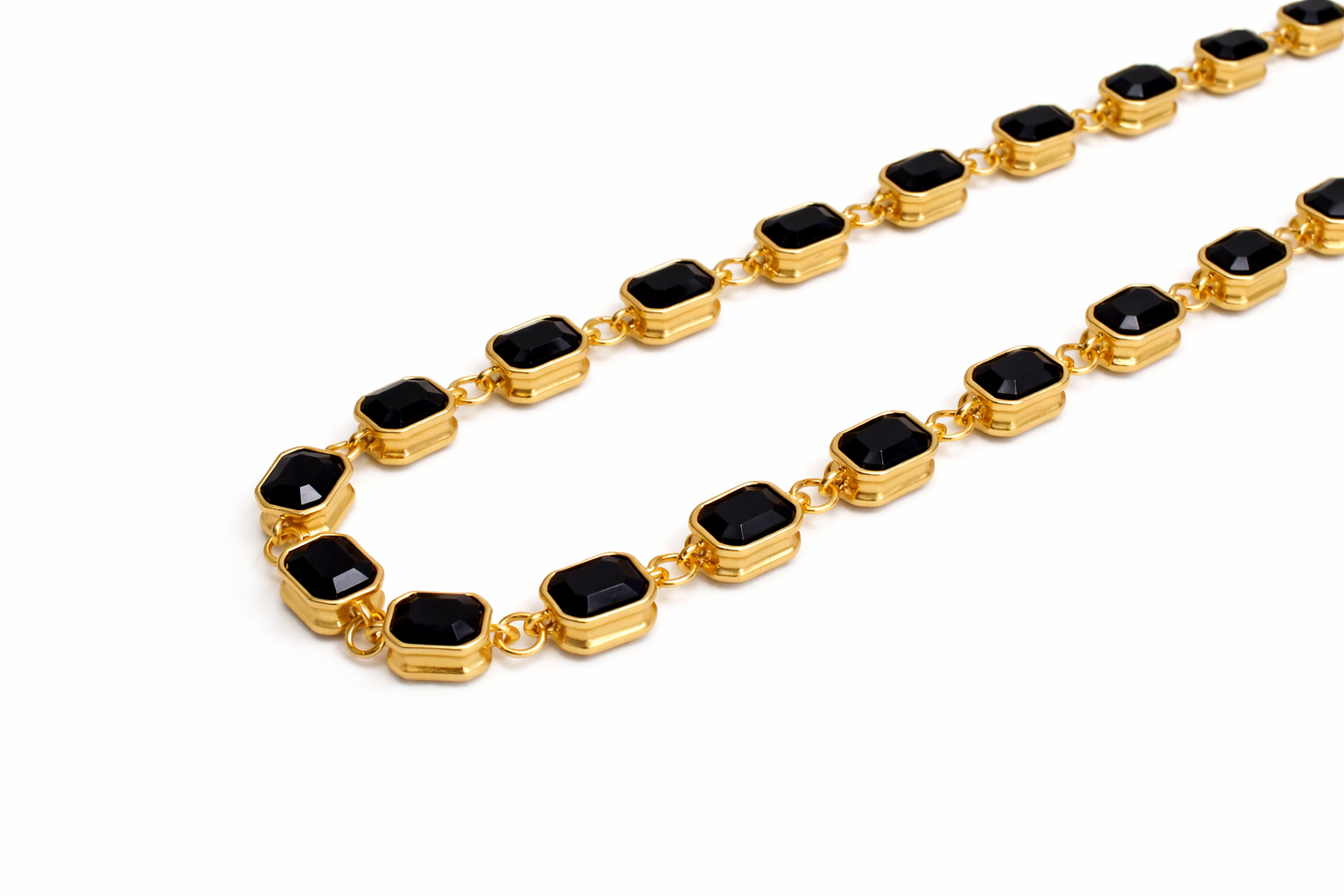 Elegant and eye-catching, this long necklace features a refined gold-tone chain adorned with a continuous sequence of faceted, octagonal stones in a rich deep black. Each stone is double-sided, allowing the facets to catch the light beautifully from every angle, and is securely set in a smooth gold-tone bezel, linked with delicate connectors for a fluid, flexible silhouette.