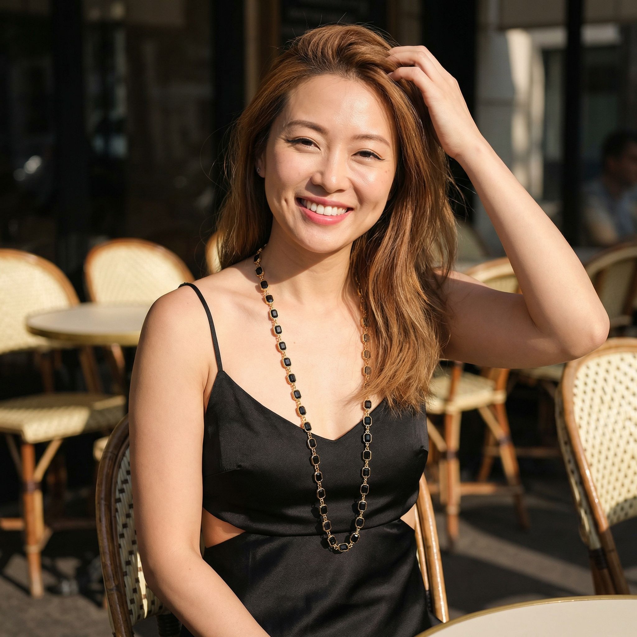NOUR elegant and eye-catching, this long necklace features a refined gold-tone chain adorned with a continuous sequence of faceted, octagonal stones in a rich deep black. Each stone is double-sided