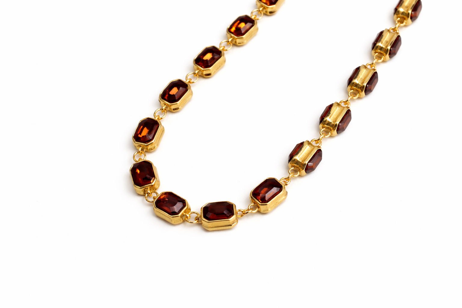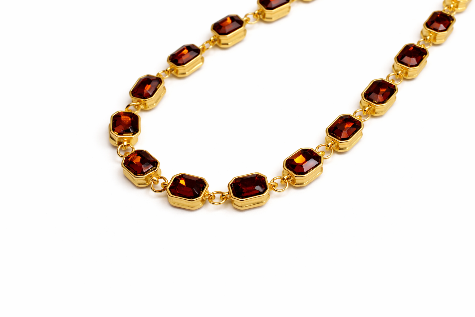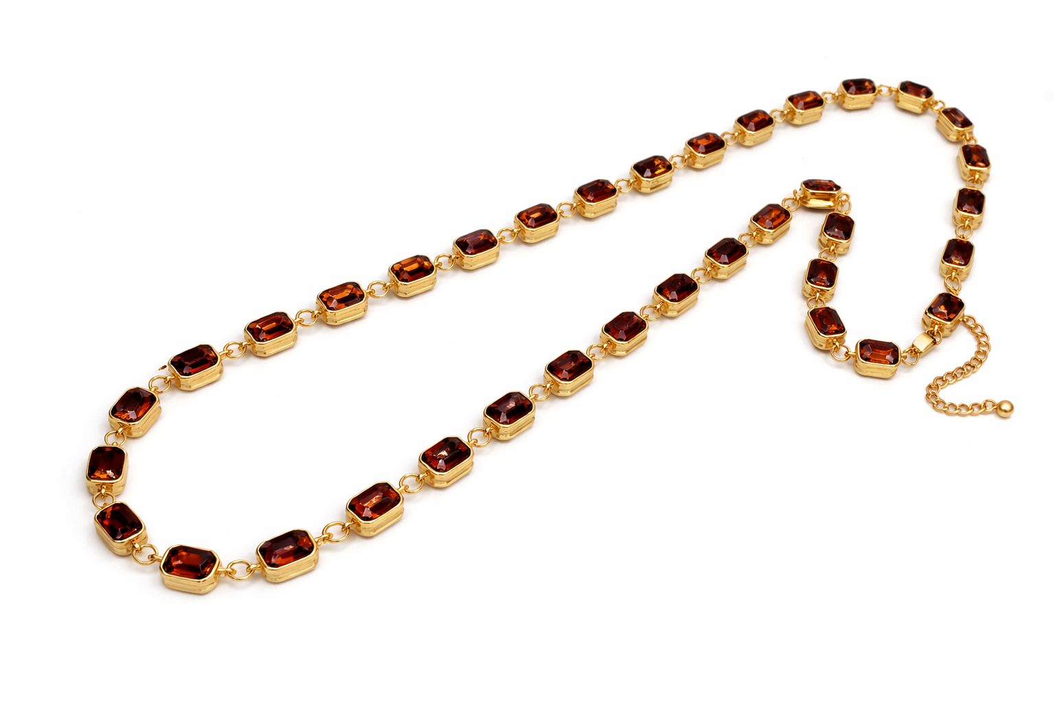 Elegant and eye-catching, this long necklace features a refined gold-tone chain adorned with a continuous sequence of faceted, octagonal stones in a rich deep amber-red hue. Each stone is double-sided, allowing the facets to catch the light beautifully from every angle, and is securely set in a smooth gold-tone bezel, linked with delicate connectors for a fluid, flexible silhouette.