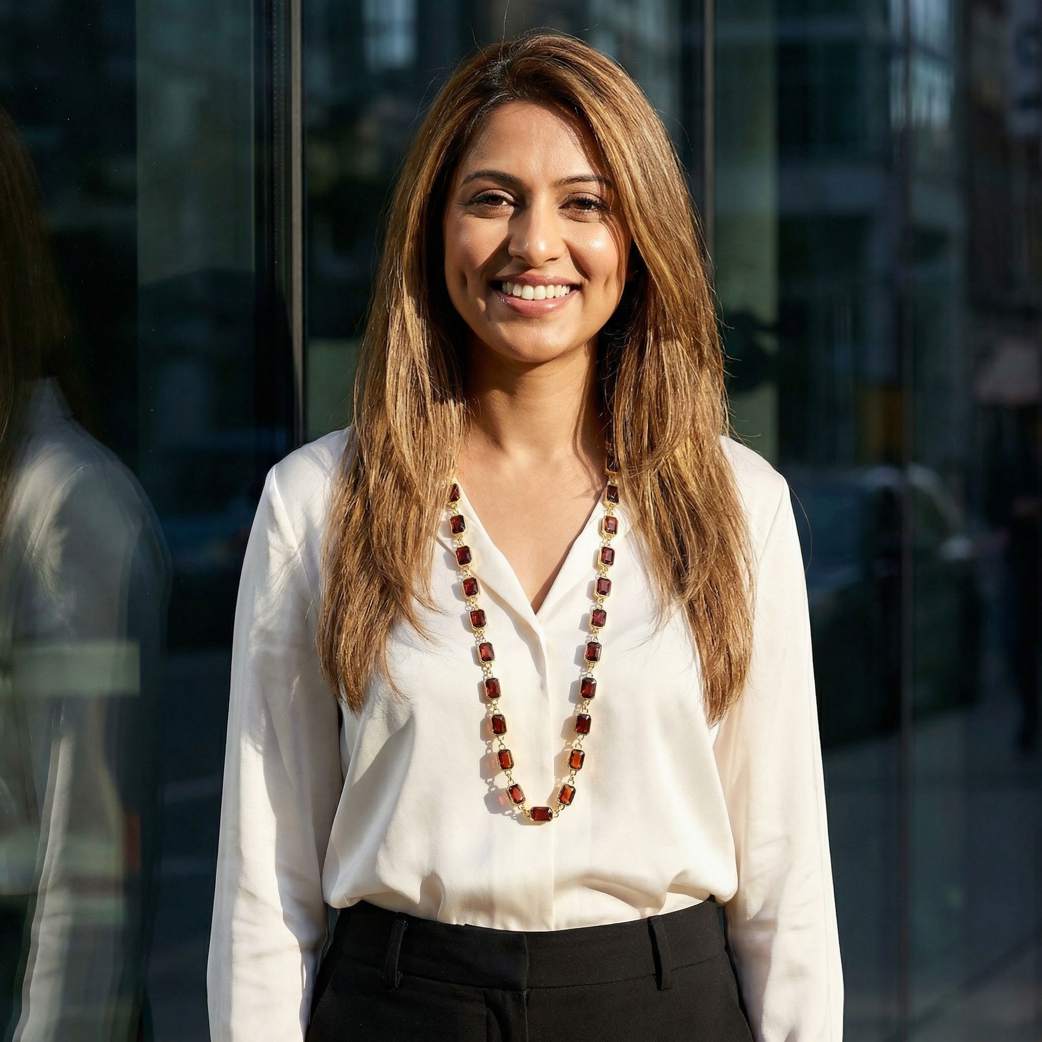 NOUR elegant and eye-catching, this long necklace features a refined gold-tone chain adorned with a continuous sequence of faceted, octagonal stones in a rich deep amber-red hue. Each stone is double-sided.