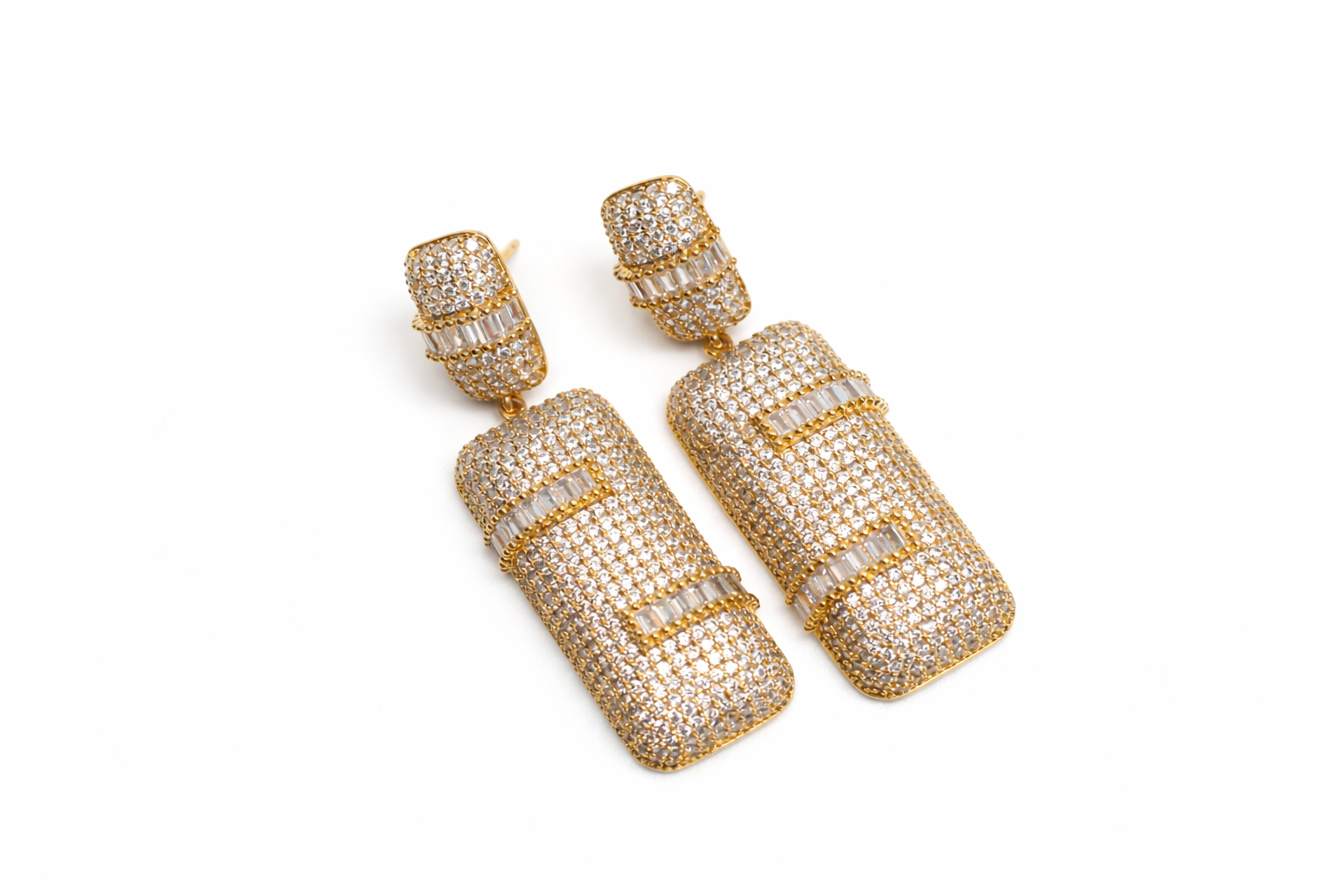 Suspended below is a substantial rectangular drop element, fully covered in shimmering crystals for an opulent, high-impact look. Across both the top and bottom sections run elegant bands of baguette-cut stones, adding contrast, structure, and a refined geometric touch to the design.