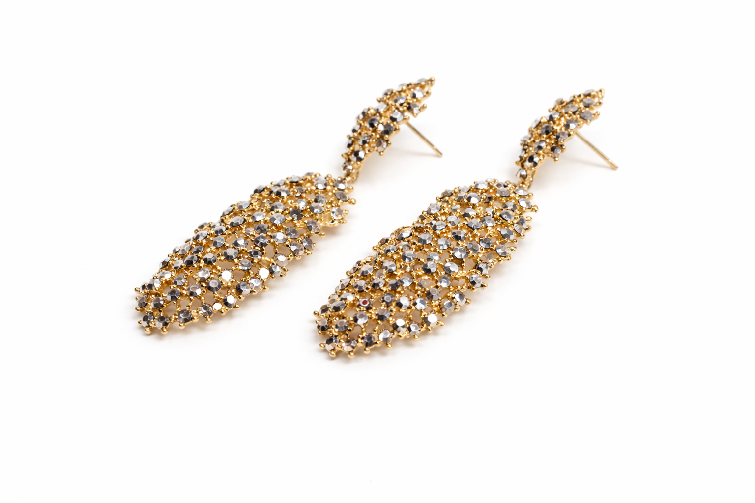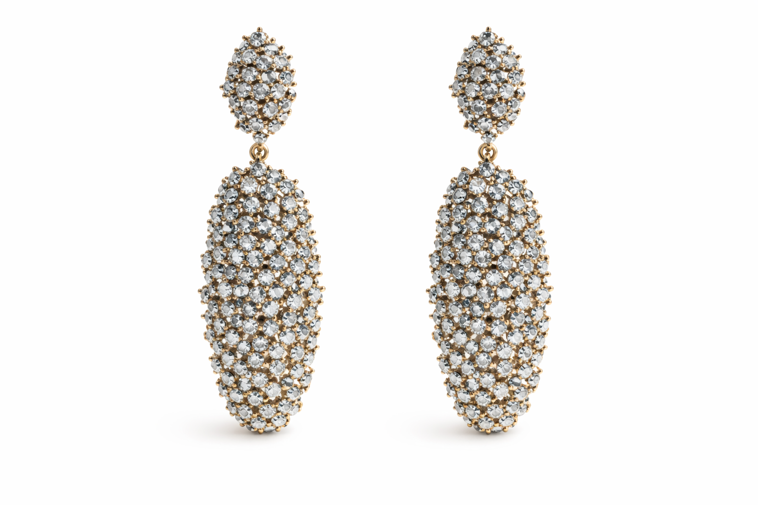 These earrings are a striking pair of drop earrings on post, designed with an elegant, elongated silhouette and a refined sparkle.