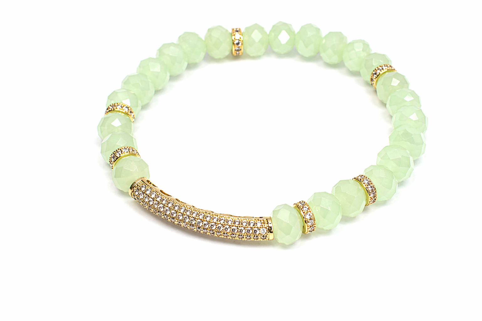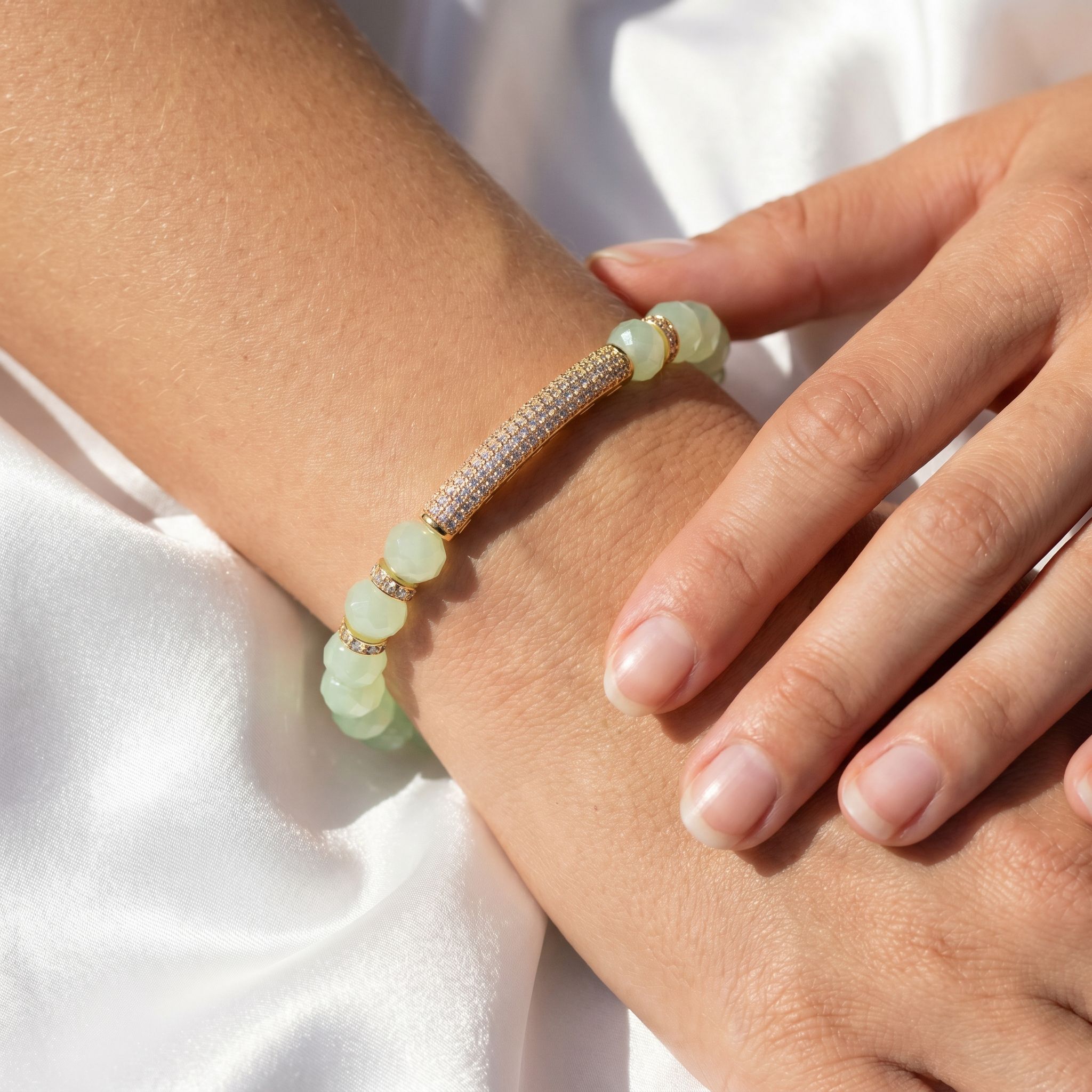 This stylish stretch bracelet features beautifully faceted semi-precious stones in a soft, fresh green hue, offering a subtle translucency and gentle sparkle with every movement. The stones are evenly shaped and polished, creating a smooth, refined look.