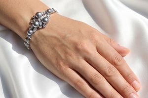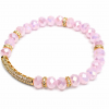 Gold-tone crystal-set spacer rings are placed throughout the design, adding delicate brilliance and elevating the overall finish. A curved pavé bar, encrusted with shimmering stones, forms the focal point—bringing a touch of glamour and sophistication.