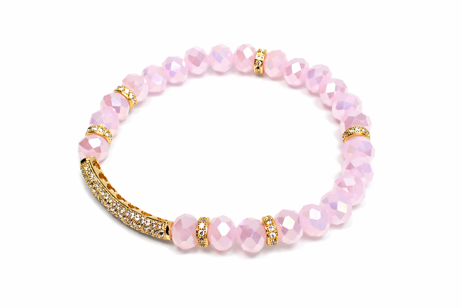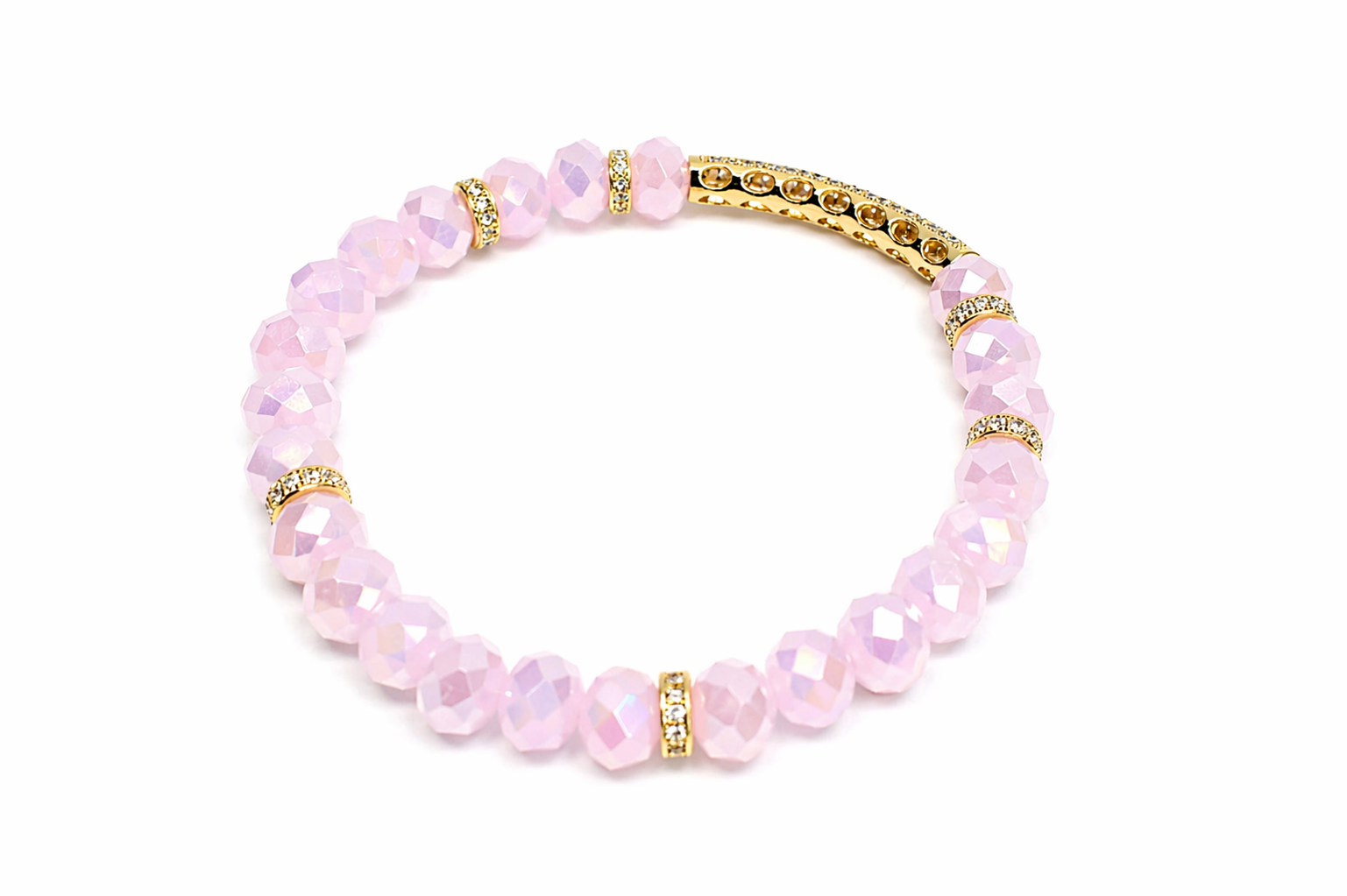 This elegant stretch bracelet is crafted with faceted semi-precious stones in a soft blush pink tone, offering a delicate yet eye-catching shimmer as it catches the light. The stones are carefully cut to enhance their natural glow, creating a refined and feminine look.