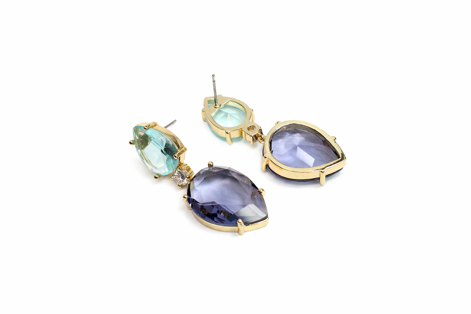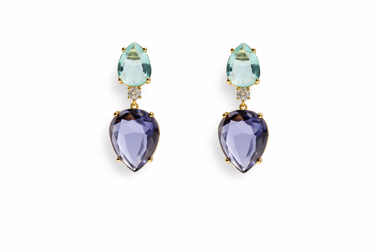 • At the top sits a pear-cut aqua-toned crystal, delicately faceted to catch the light and add a fresh, luminous glow.
