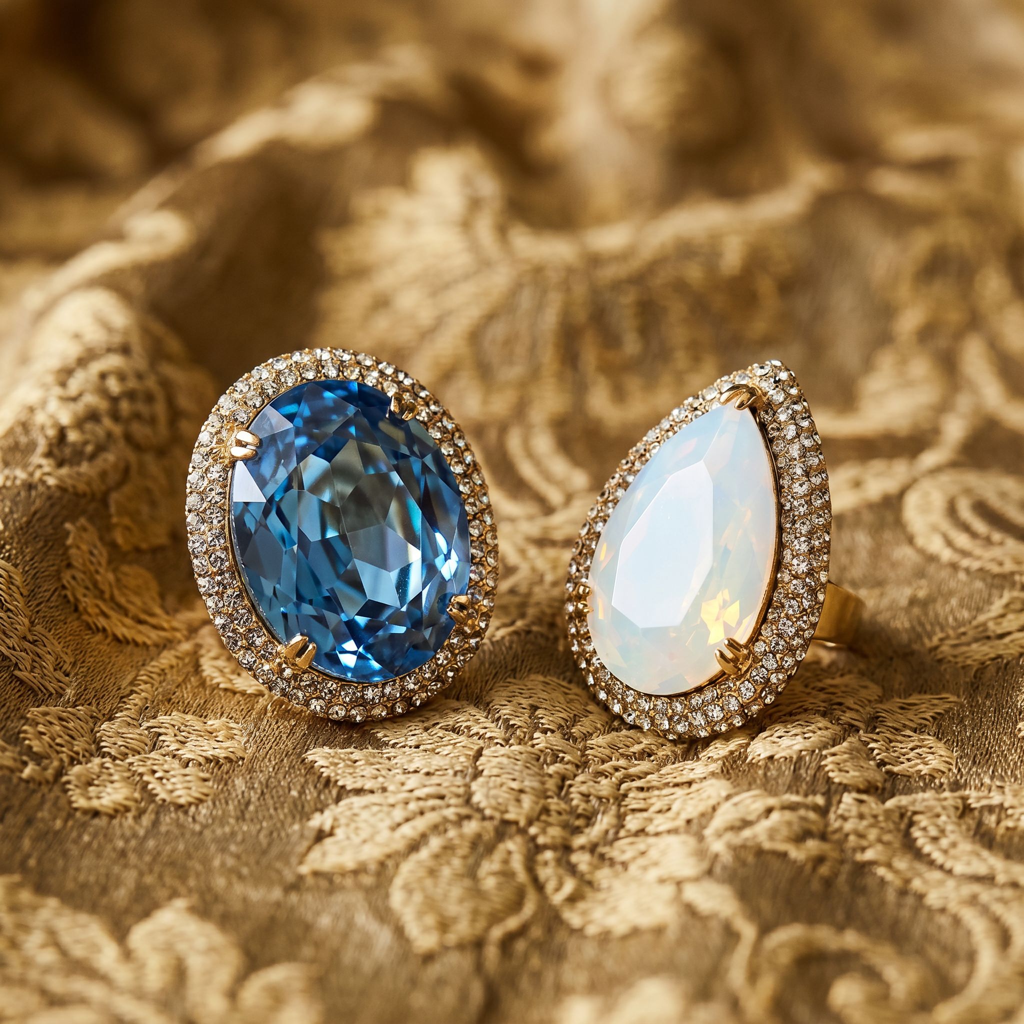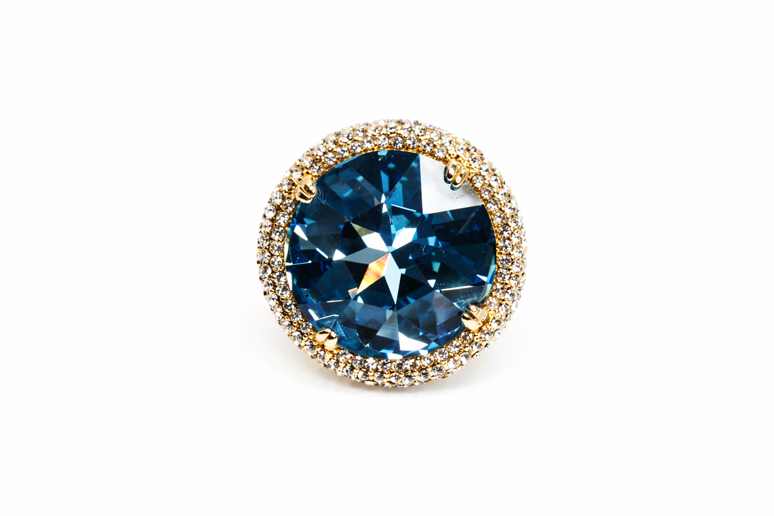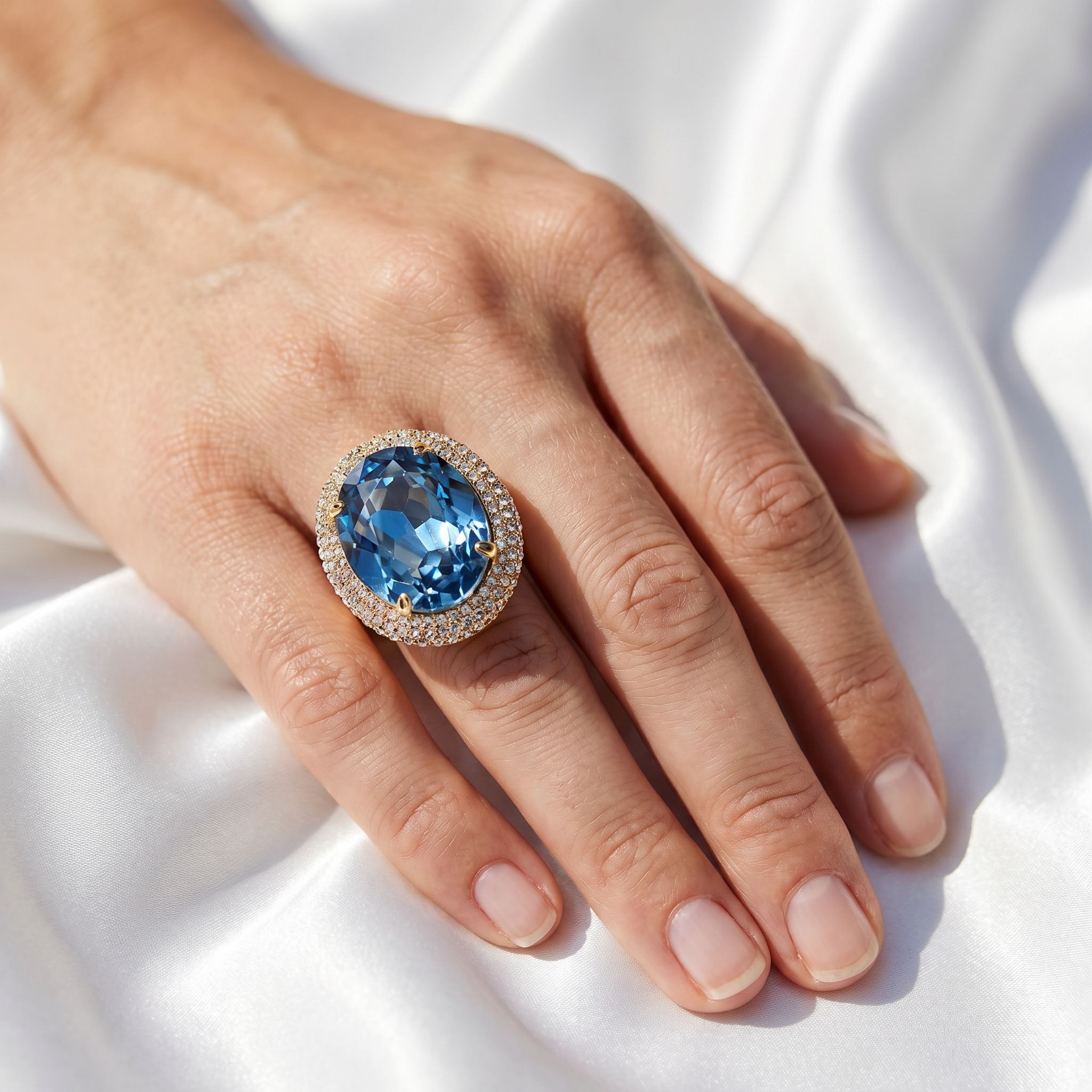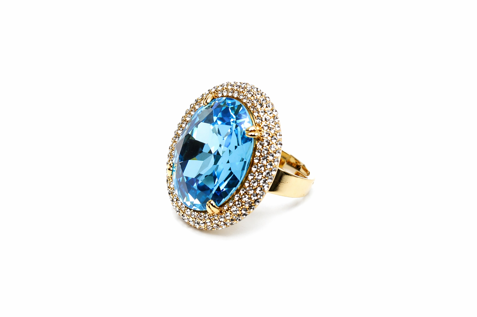 This bold statement ring showcases a large, faceted oval Swarovski crystal in a vivid, ocean-blue tone. The centre stone is precision-cut to maximise brilliance, reflecting light beautifully with every movement and creating a striking, eye-catching sparkle.