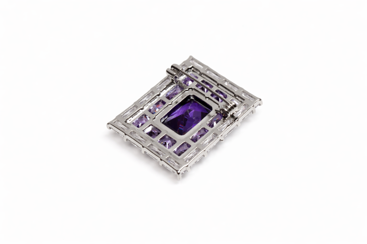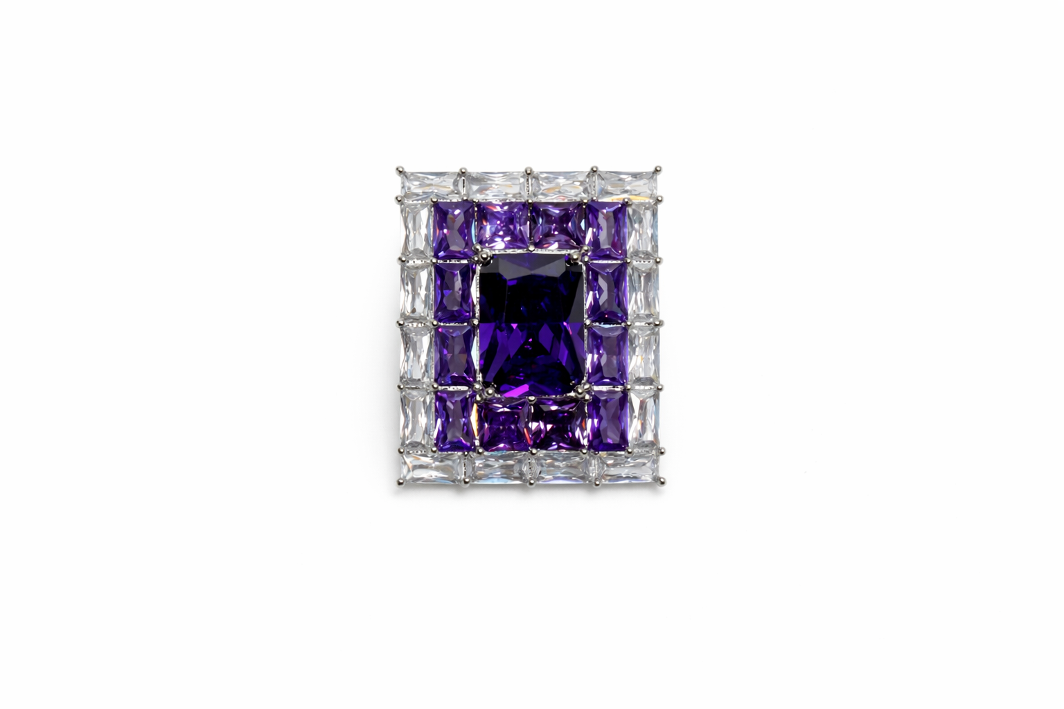A bold and sophisticated rectangular brooch designed to make a statement. At its centre sits a striking deep violet crystal in an emerald-cut style, radiating rich colour and depth. This focal stone is beautifully framed by a geometric arrangement of smaller violet stones, surrounded by a border of clear, baguette-cut crystals that add brilliance and contrast.