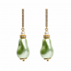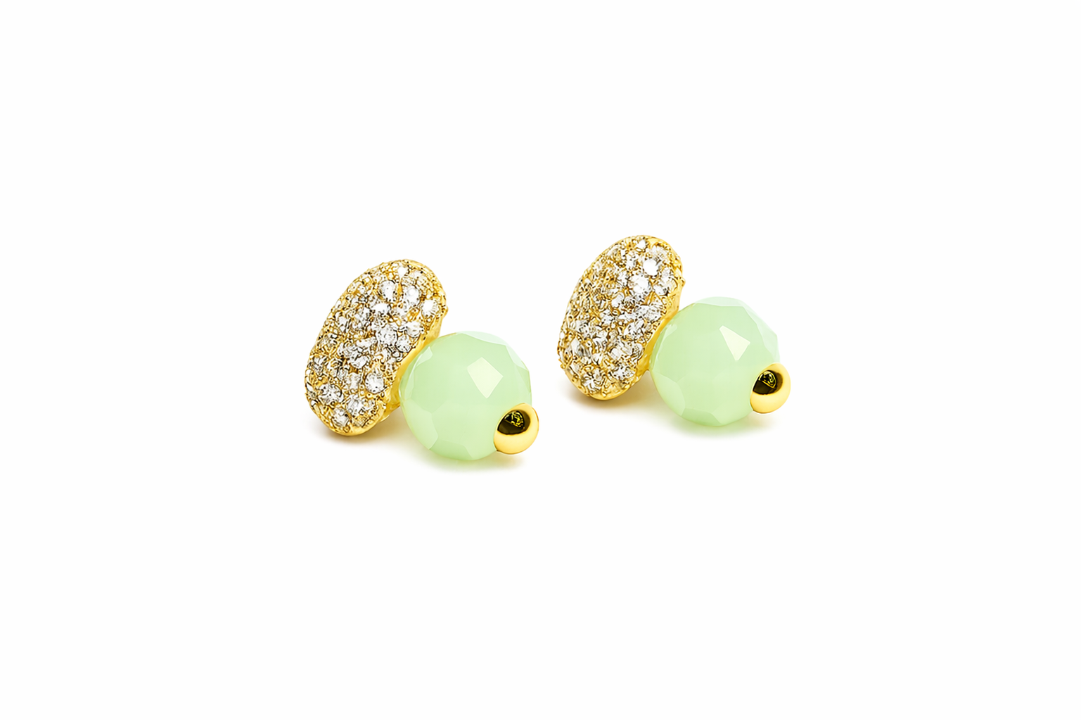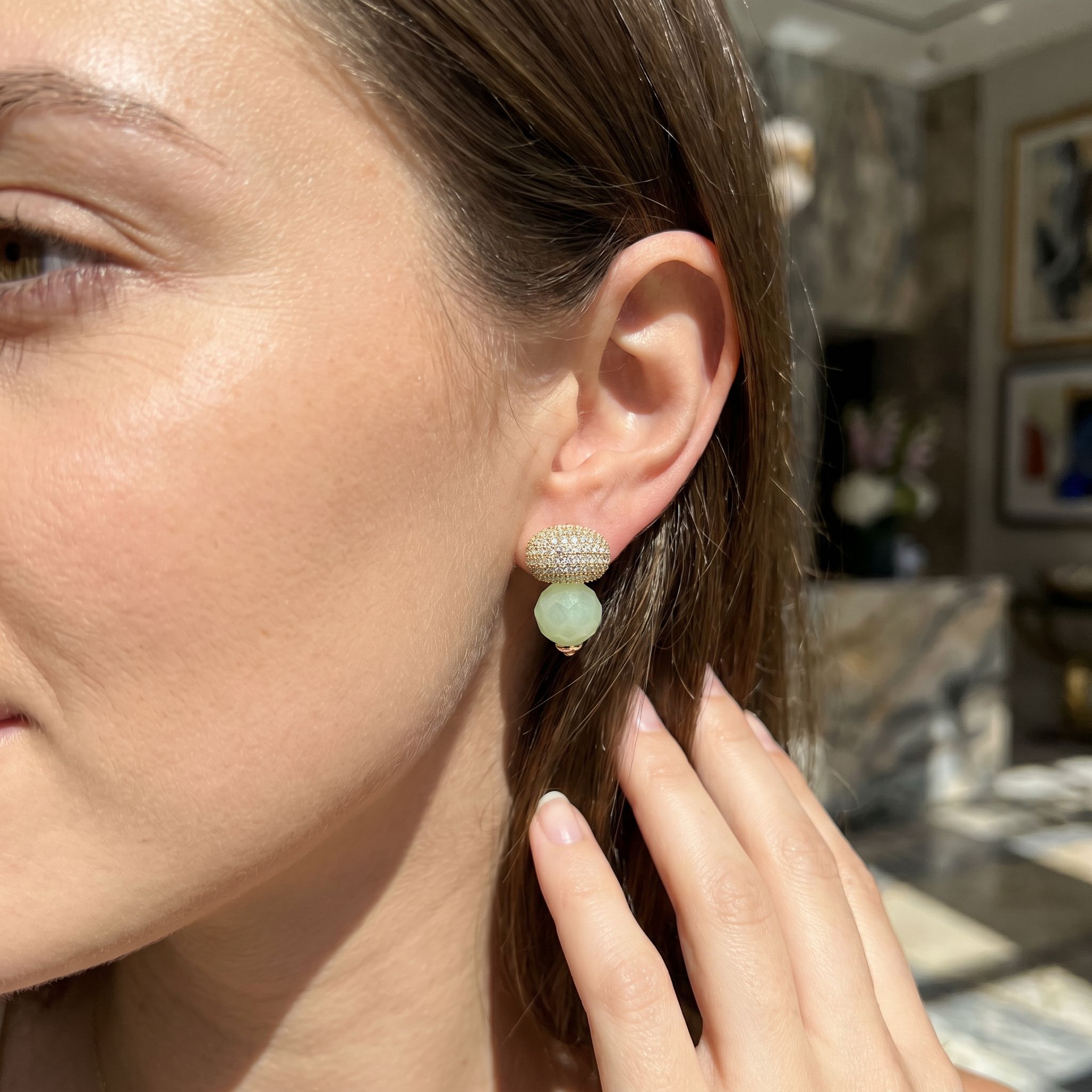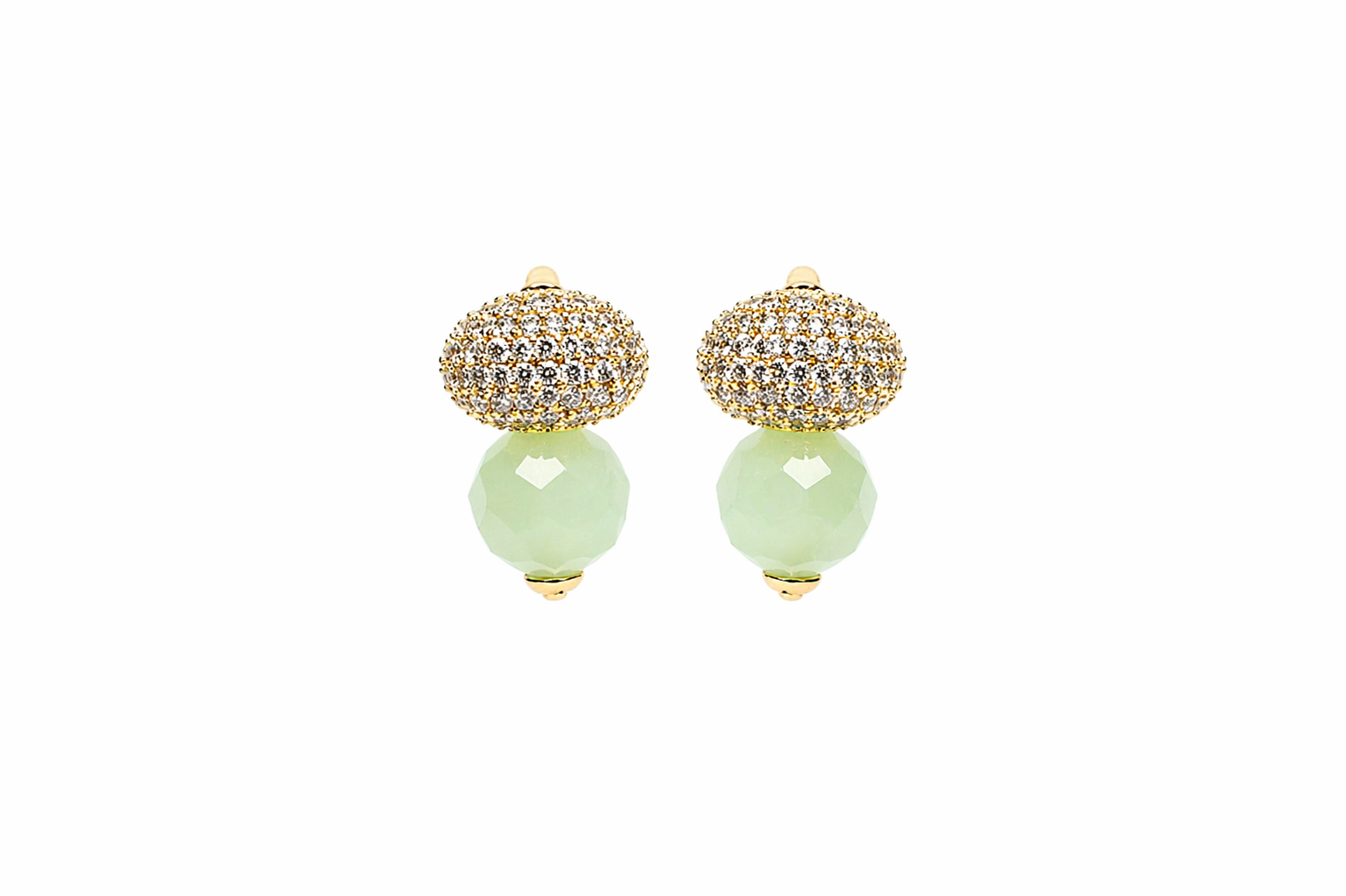 At the top sits a rounded, gold-tone dome encrusted with fine pavé-set crystals, creating a radiant, shimmering surface that catches the light beautifully. Suspended beneath is a faceted semi-precious stone in a soft, translucent mint-green hue, adding a fresh and delicate pop of colour.