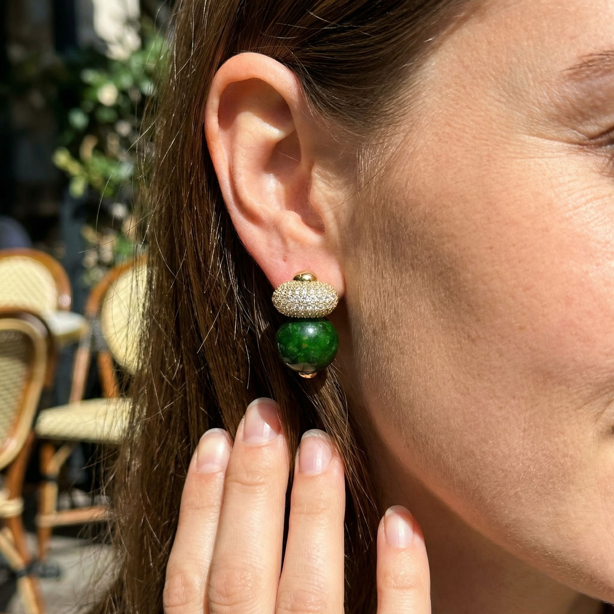 The focal point is a pair of deep green spherical beads, featuring a slightly marbled, natural stone-like texture that adds depth and uniqueness to each piece. The glossy surface enhances the richness of the green, giving the earrings a refined and sophisticated look.