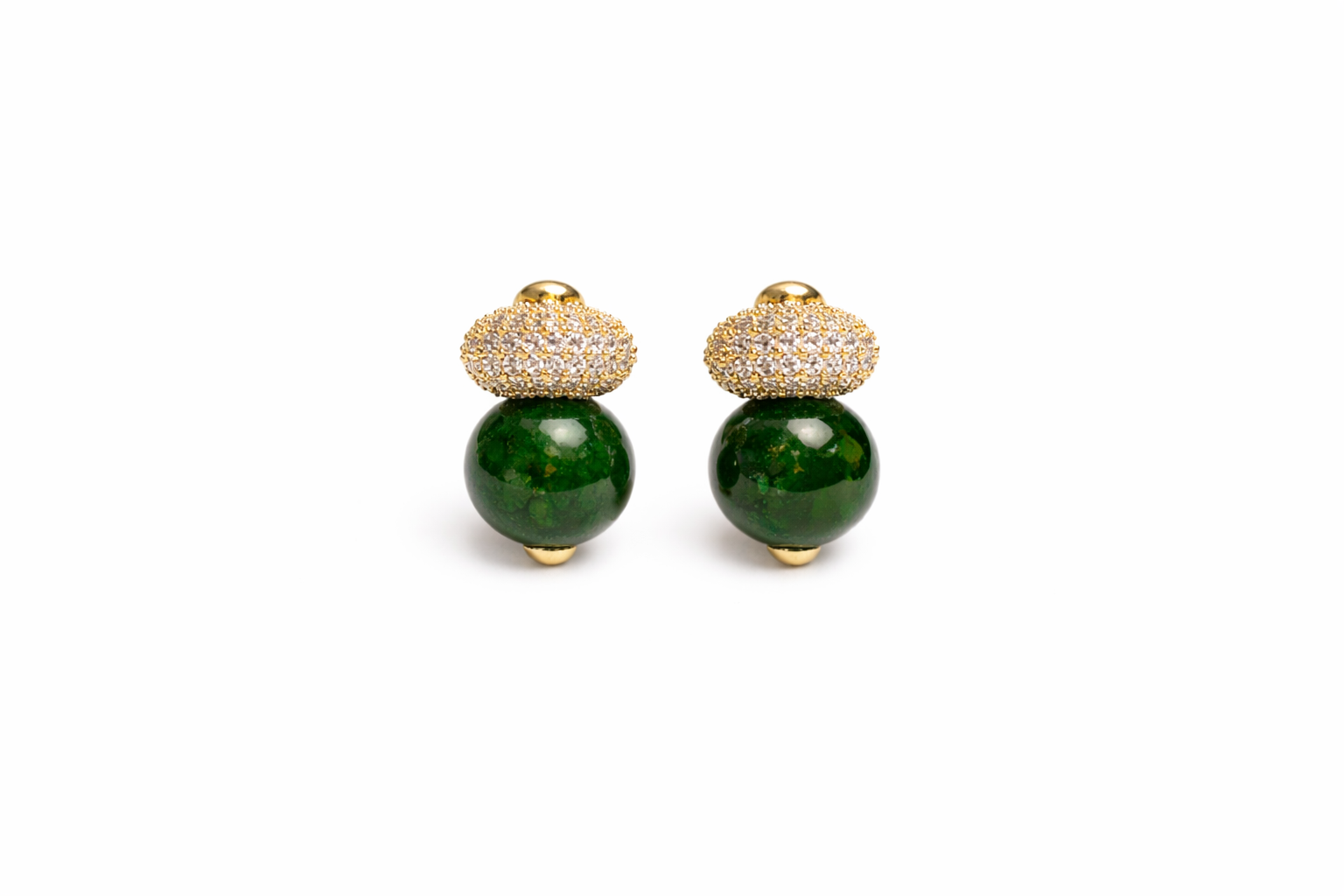 Above each bead sits a domed pavé-set top, encrusted with fine clear crystals that deliver a brilliant sparkle. The crystals are set in a gold-tone base, creating a warm contrast against the cool green tones below.
