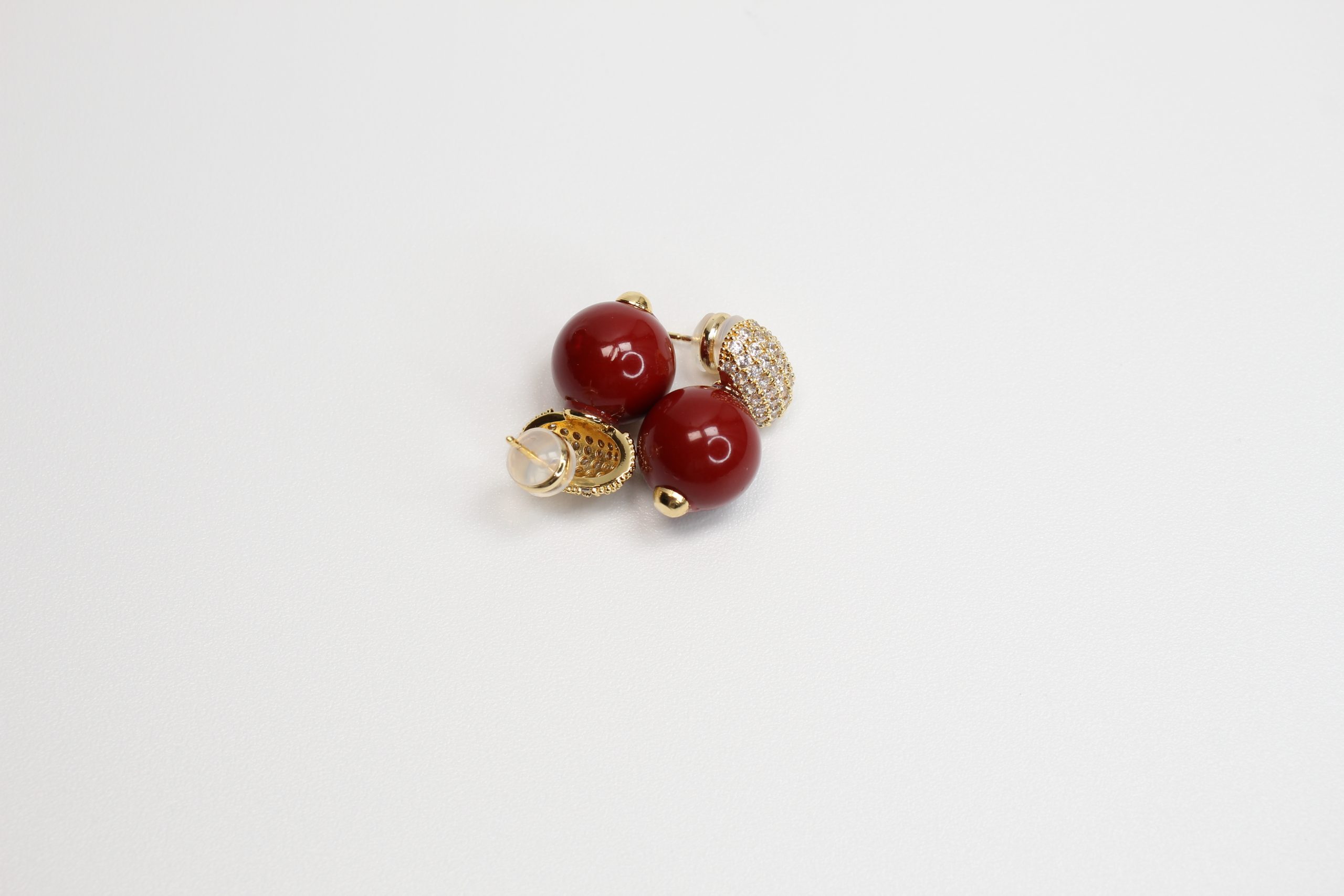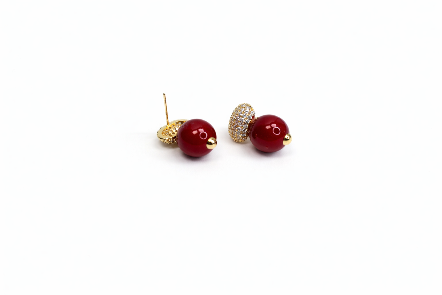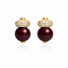 They feature a smooth, round burgundy colour bead as the main focal point, finished with a glossy surface that reflects light beautifully. The bead sits below a crystal-encrusted pavé dome, creating a striking contrast between the vibrant colour and the shimmering top detail.