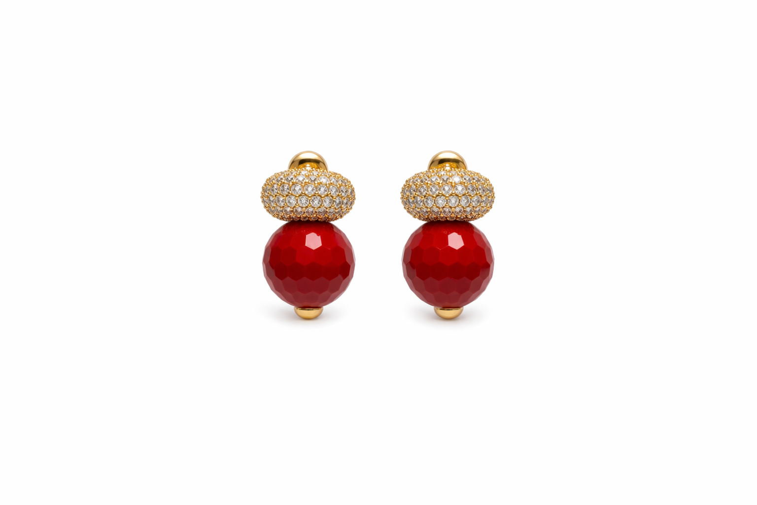 The earrings feature vibrant red faceted beads as the focal point, cut to reflect light beautifully and add subtle sparkle. Each bead is capped with a polished gold-tone tip, enhancing the richness of the red hue.