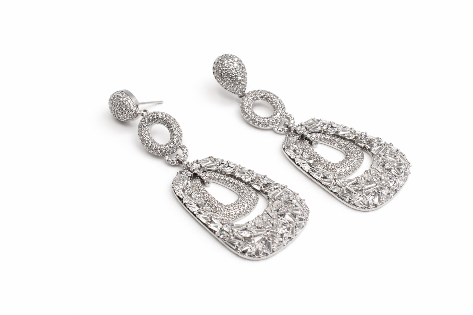 Each earring begins with a teardrop-shaped stud, fully pavé-set with fine crystals for a brilliant, light-catching effect. This connects to a circular link, also encrusted with shimmering stones, creating a delicate yet eye-catching transition.