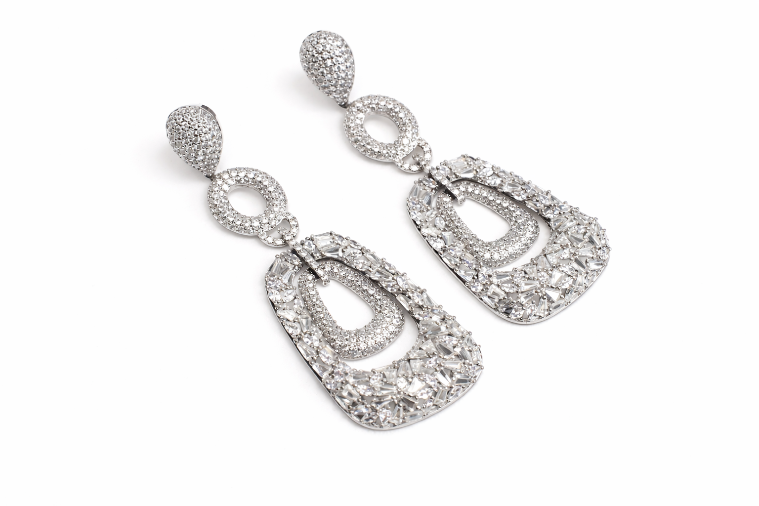 The main body of the earring showcases an open, geometric drop design, framed with a mix of small round and baguette-cut crystals arranged in a textured, multidimensional pattern. At the centre, a smaller pavé-set oval adds depth and extra sparkle, enhancing the layered look.