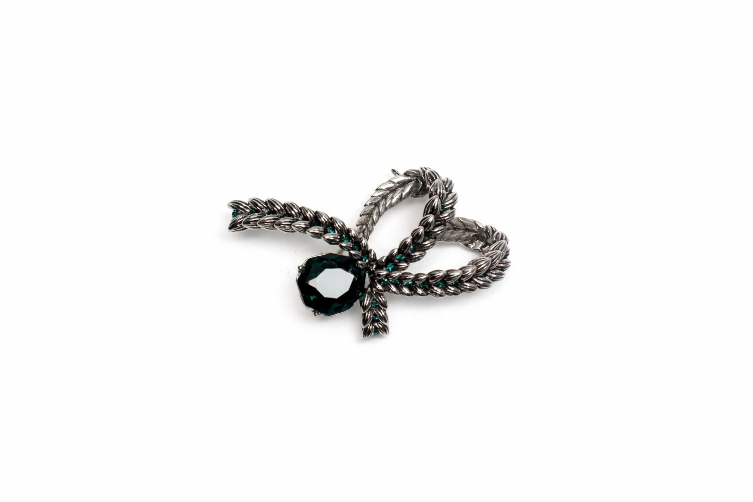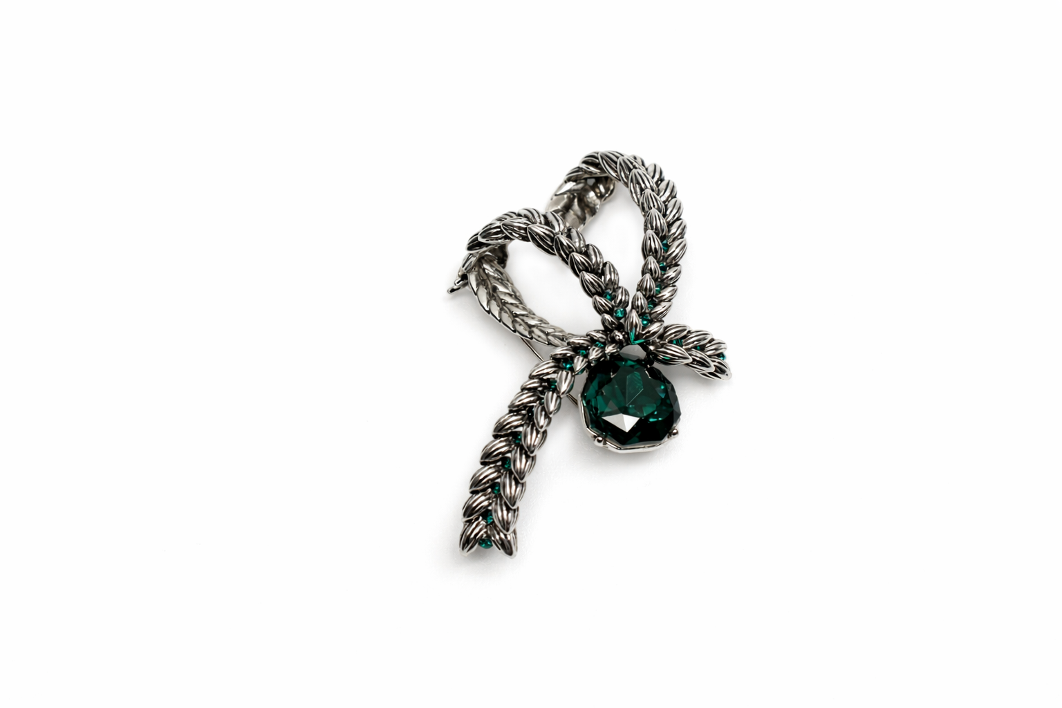 The form resembles a softly tied bow or flowing ribbon, created with twisted rope-like strands that give the piece texture and dimension. Along the curves, subtle deep green crystal accents are delicately set, adding a hint of sparkle without overpowering the design.