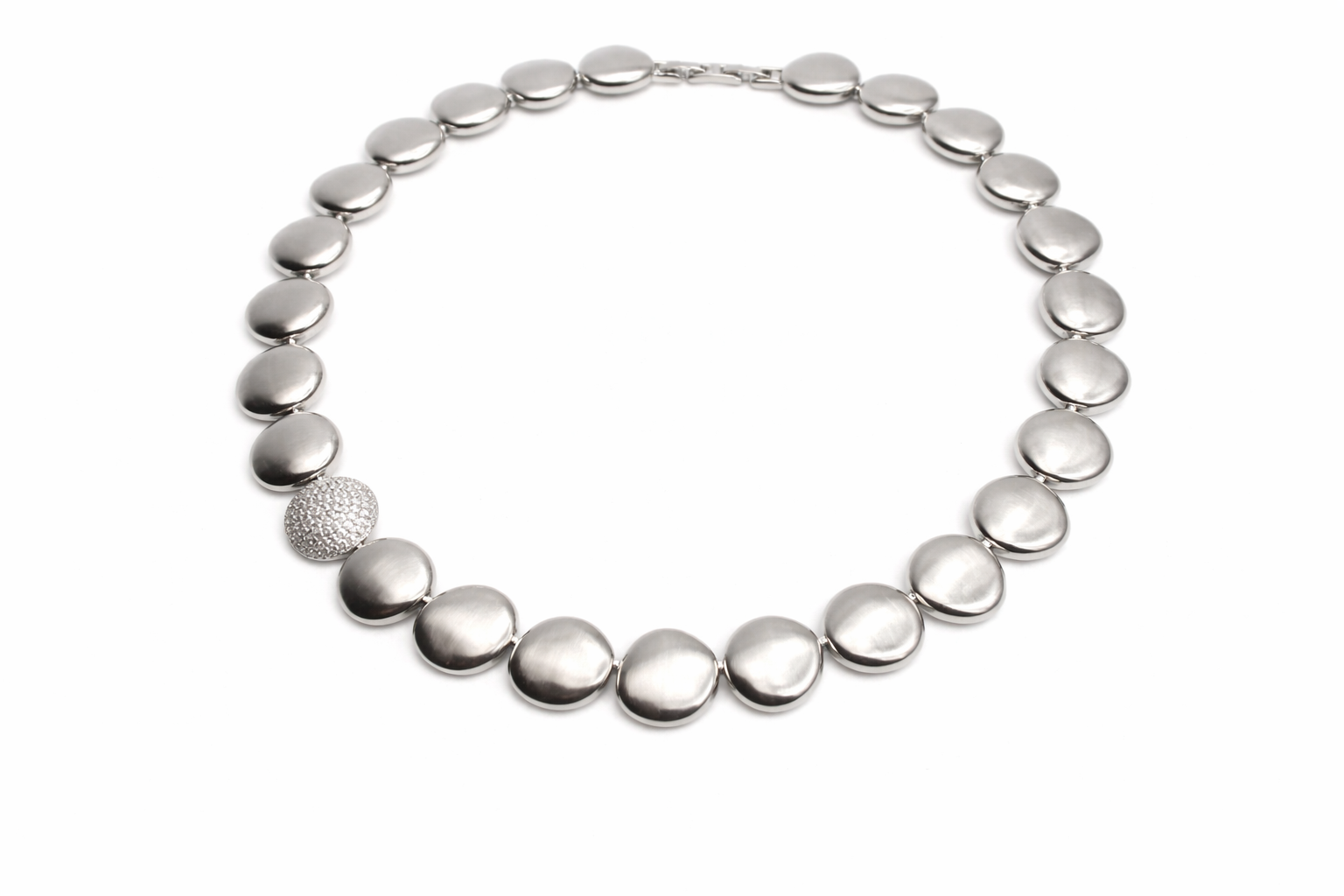 A distinctive highlight of the piece is a single accent link set with pavé-style clear crystals, adding a subtle touch of sparkle and contrast against the matte silver finish. This detail elevates the otherwise minimalist design, making it both contemporary and eye-catching.