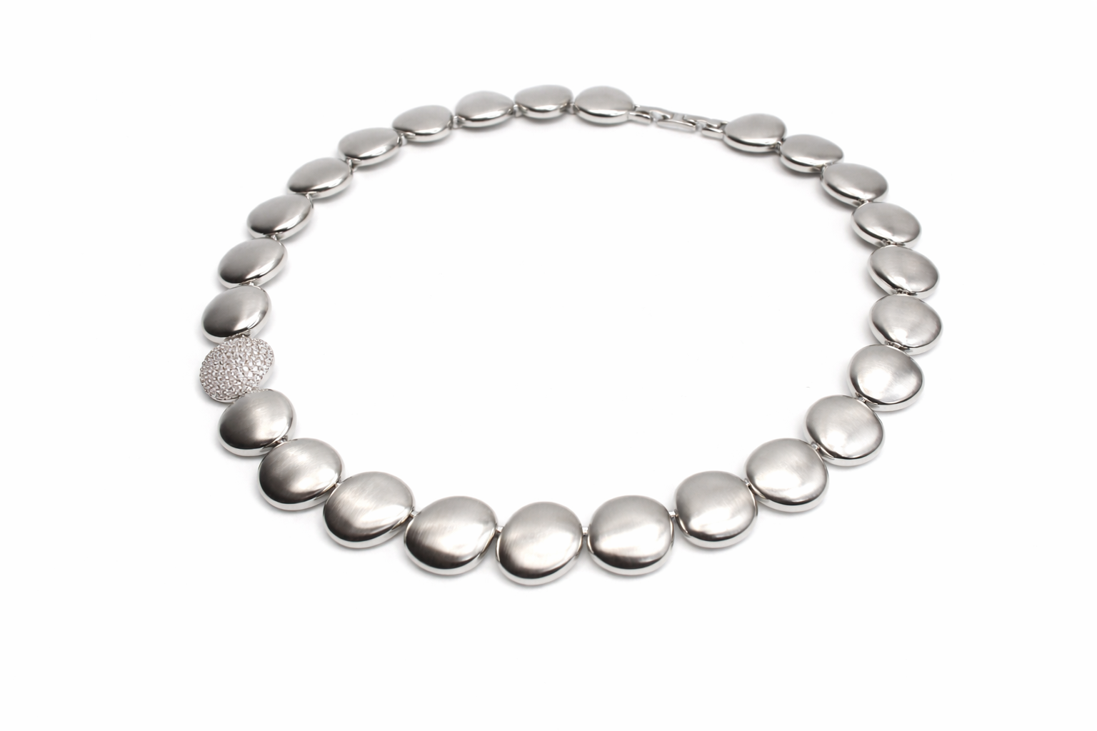 It is composed of a continuous row of smooth, pebble-shaped links in a silver-tone metal, each with a softly brushed (satin) texture that gives a refined, understated sheen. The rounded, organic shapes sit closely together to create a fluid, collar-style silhouette that rests elegantly along the neckline.