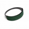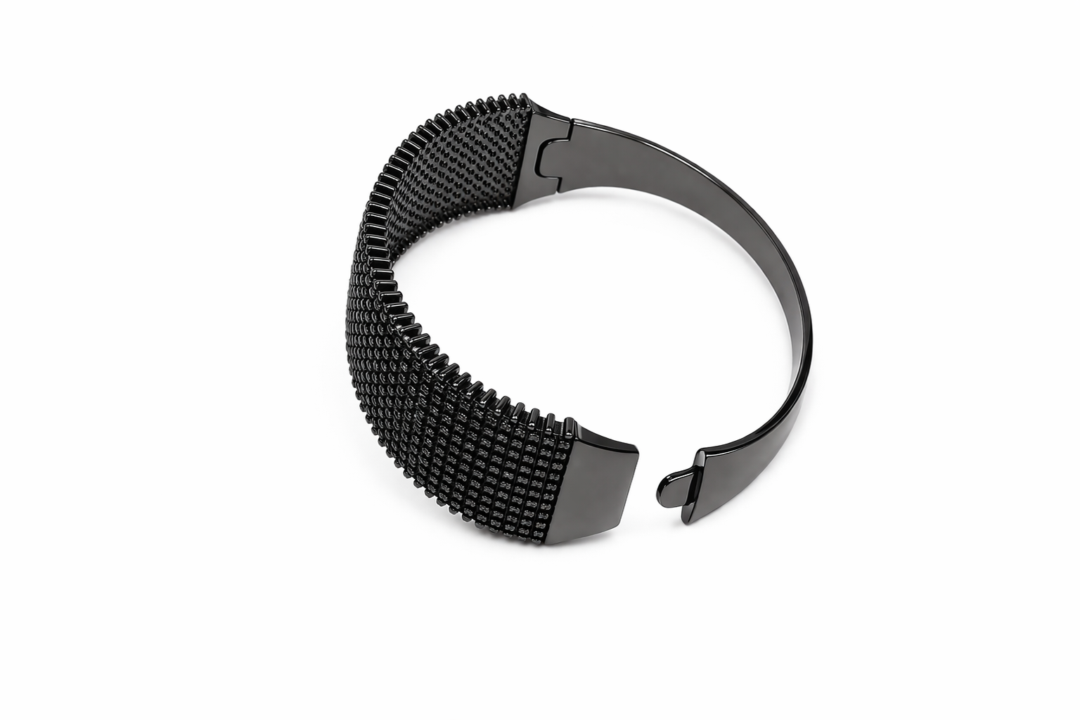 Designed in a polished black-tone metal, it features a structured bangle silhouette with a wide front panel intricately set with rows of tiny black crystals. The dense pavé-style setting creates a rich, textured surface that subtly sparkles as it catches the light, adding depth and sophistication without overpowering the look.