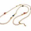 NOUR long, fine gold-tone chain is punctuated with smooth, oval beads in a playful mix of colours—soft blue, mint green, creamy ivory, bright yellow, and rich red. The beads are evenly spaced along the chain, creating a light, flowing rhythm as the necklace drapes.