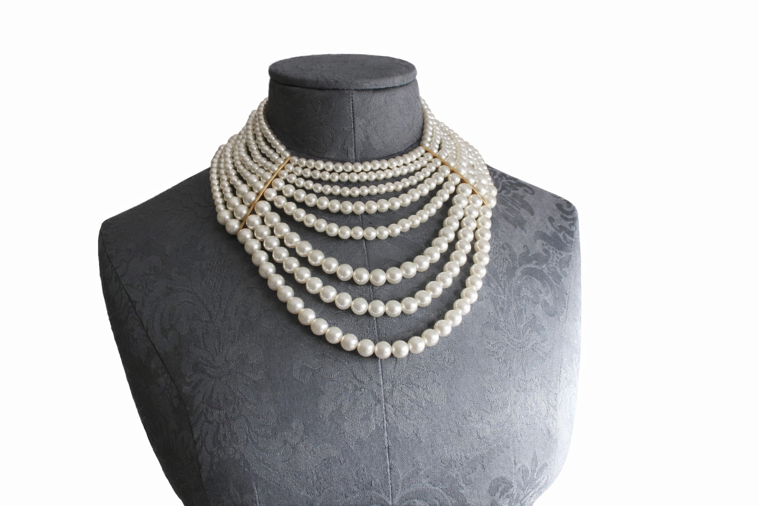 This statement necklace is a beautifully crafted multi-layered pearl collar, designed to sit high on the neckline with a graceful, cascading effect.