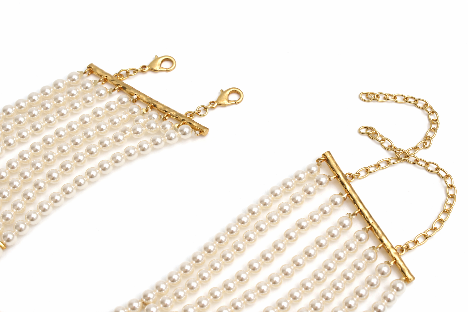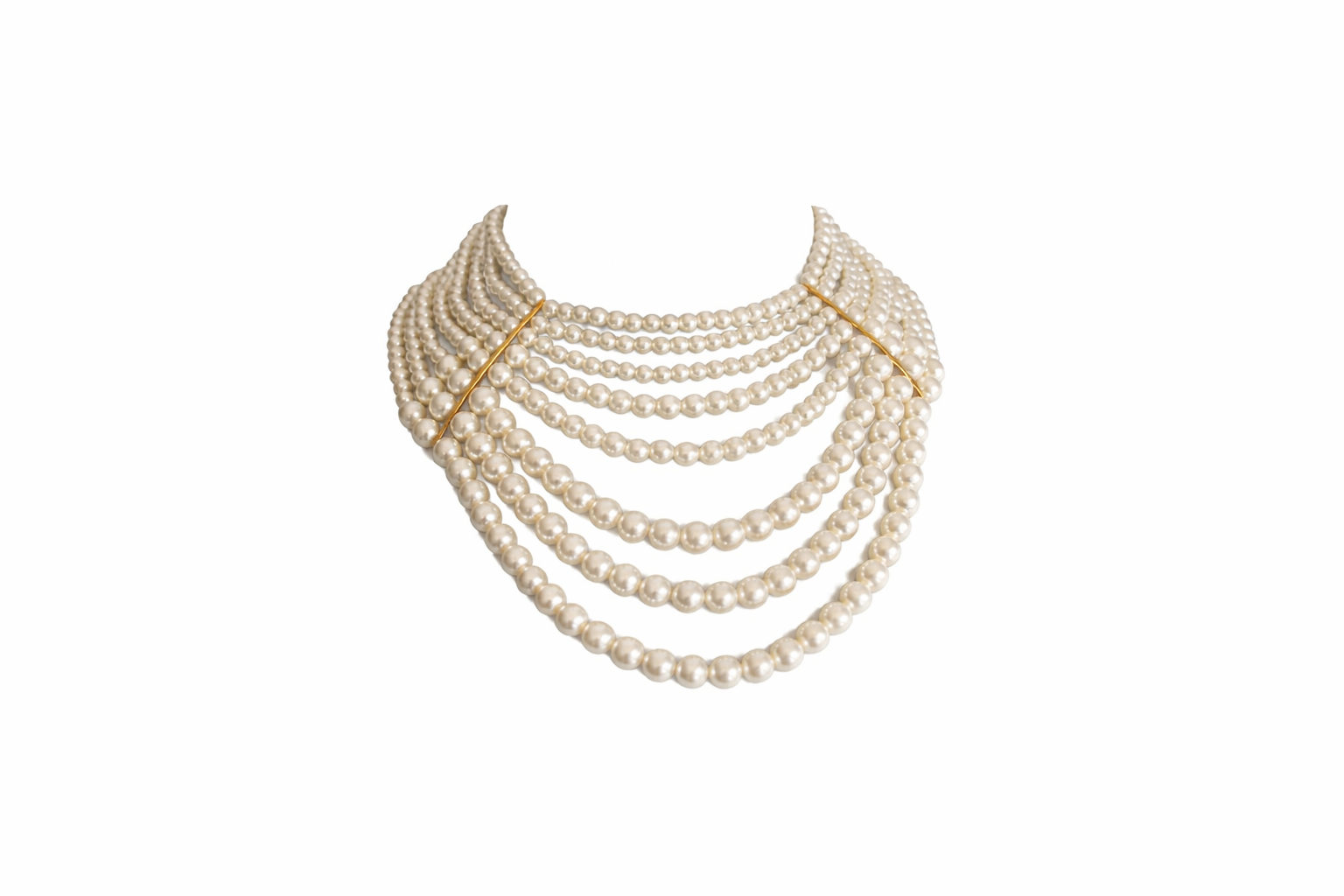 Each strand is meticulously aligned and anchored at the sides by sleek gold-tone bars, which act as both structural supports and subtle decorative accents. These bars allow the strands to fan out evenly, giving the necklace its signature sculptural shape.