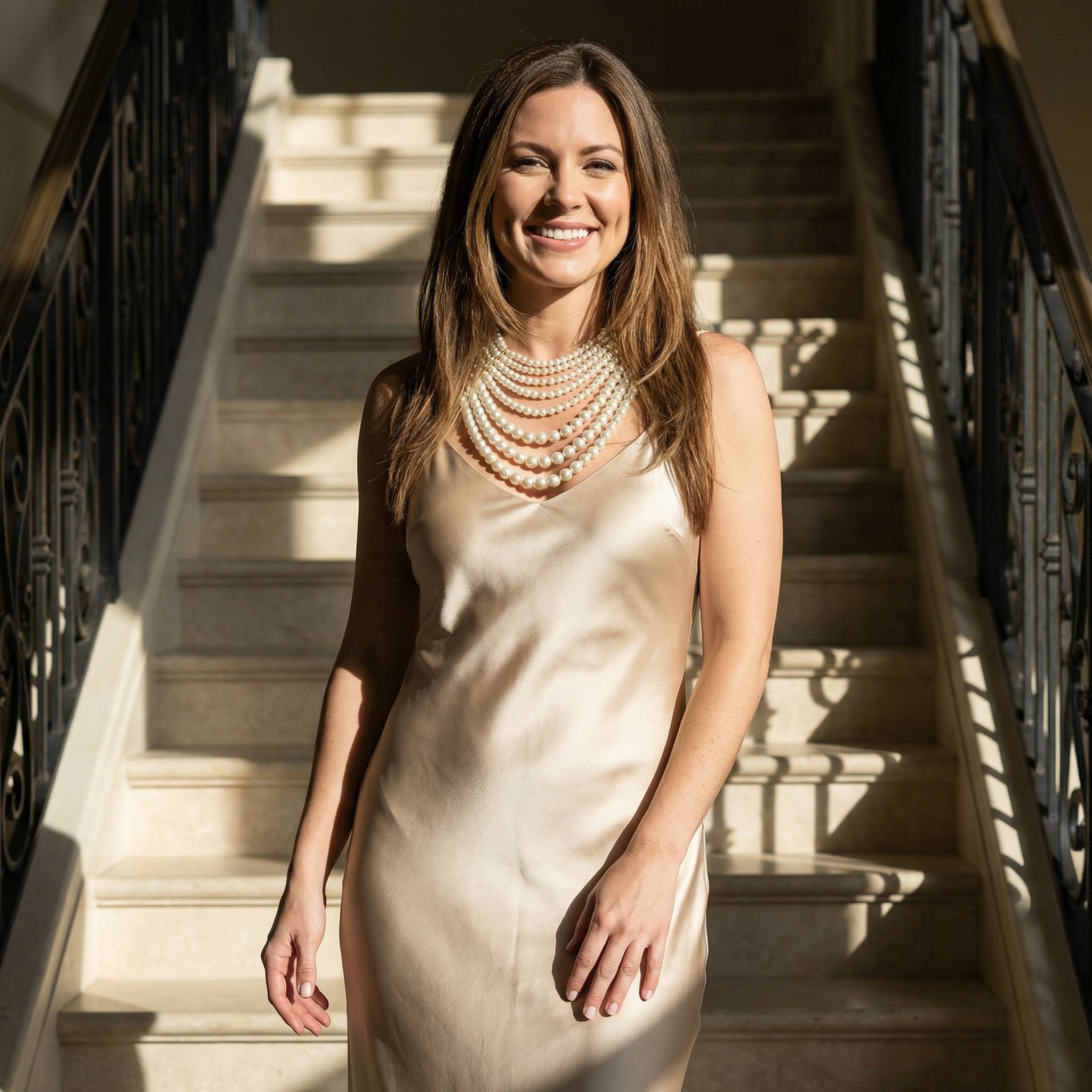 The piece features numerous strands of high-lustre ivory pearls, arranged in a carefully graduated formation. The shortest strands sit close to the neck, while longer strands drape progressively lower, creating a soft, elegant waterfall silhouette.