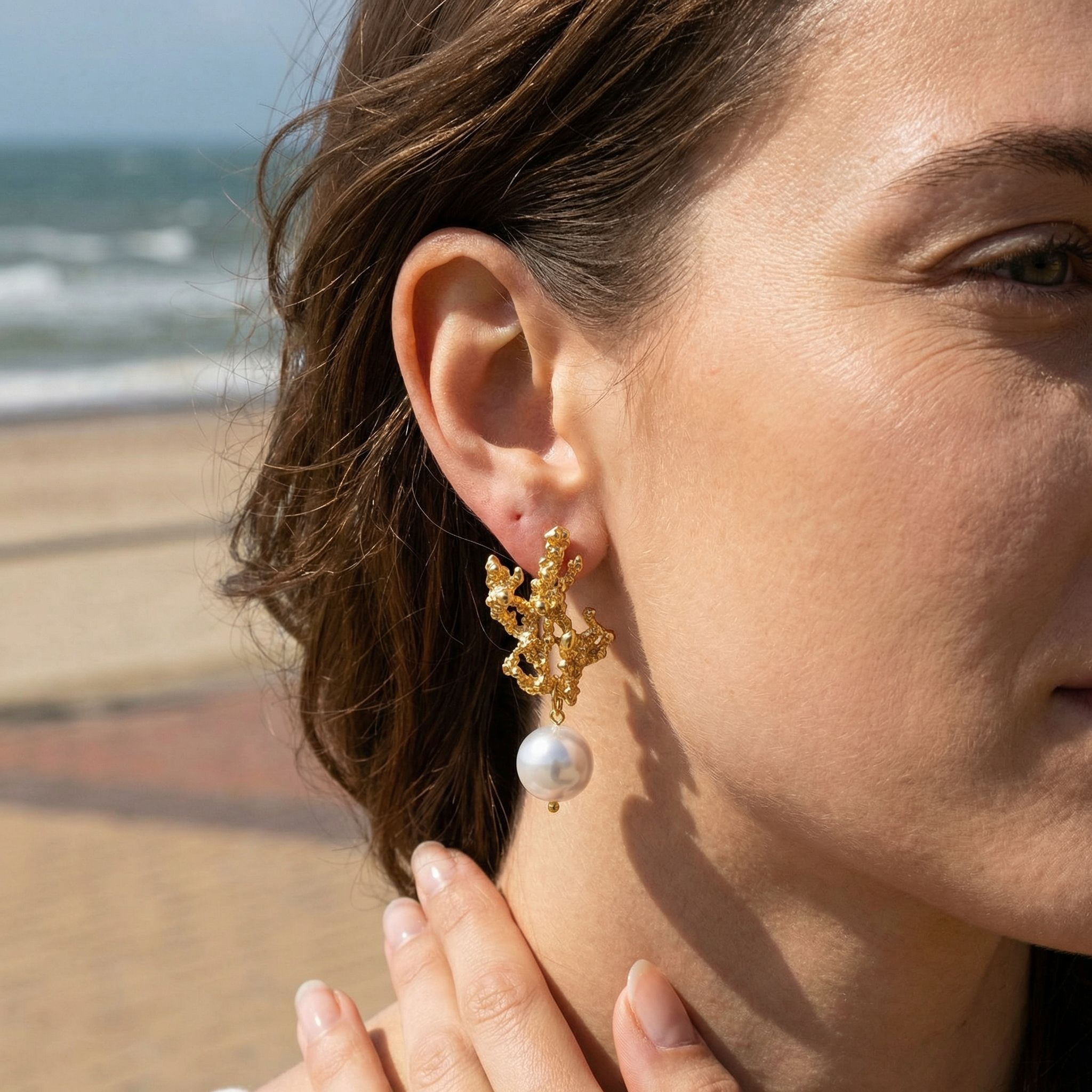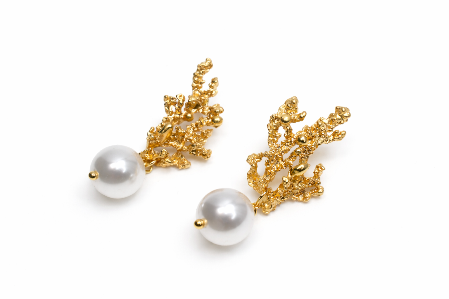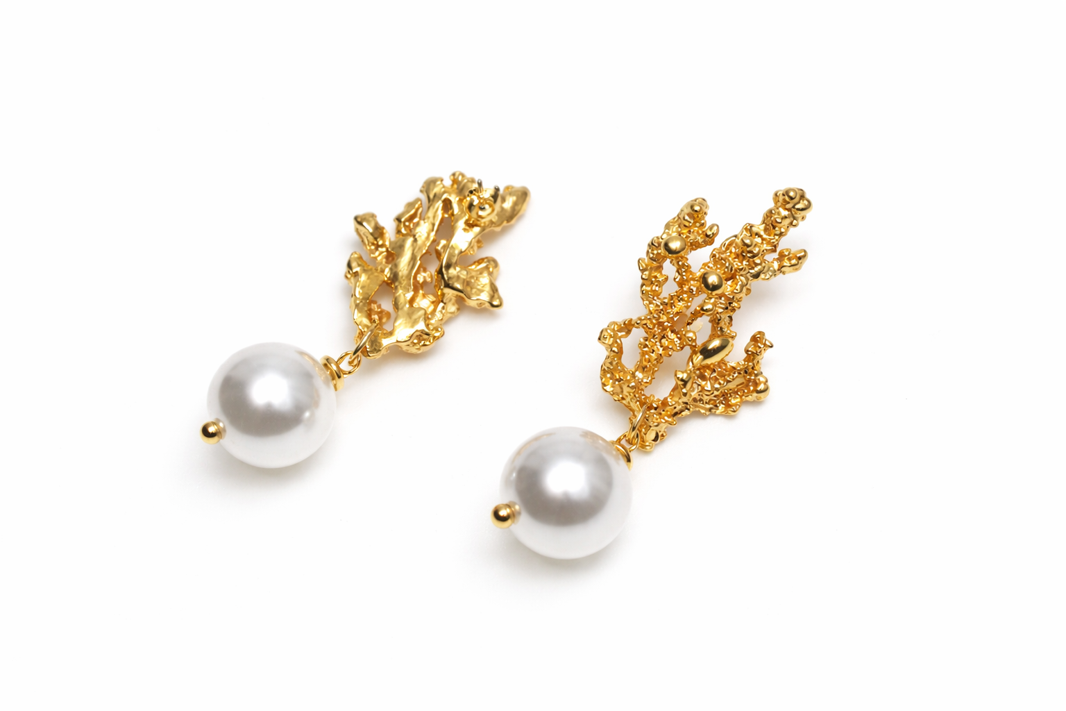 Crafted in a gold-tone finish, each earring is formed in an intricate, coral-inspired shape that sits elegantly on the ear as a post. The textured surface adds depth and a sculptural quality, giving the piece a natural, artistic feel.