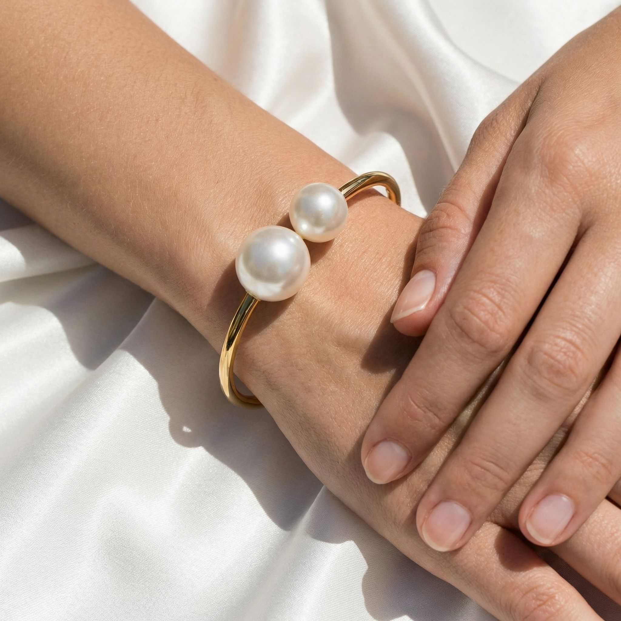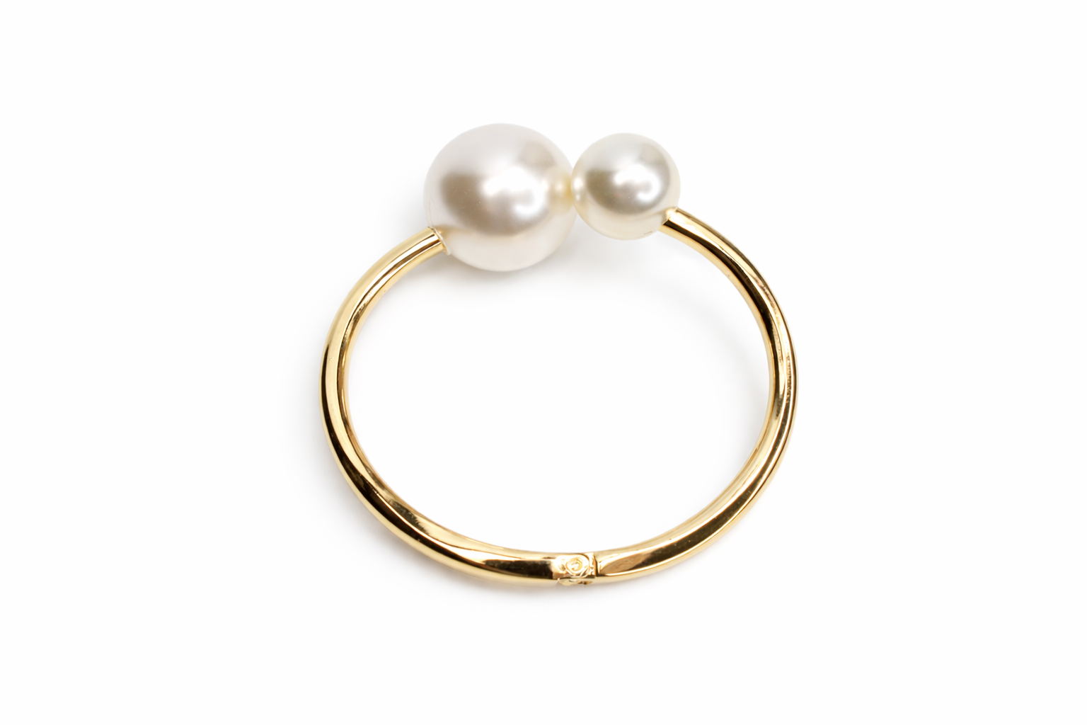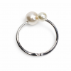 At the focal point of the design sit two lustrous pearls of متفاوت sizes. The larger pearl creates a bold, eye-catching statement, while the smaller pearl adds balance and subtle sophistication. Their soft, radiant sheen contrasts beautifully with the high-shine metal band, giving the piece a timeless and elegant appeal.