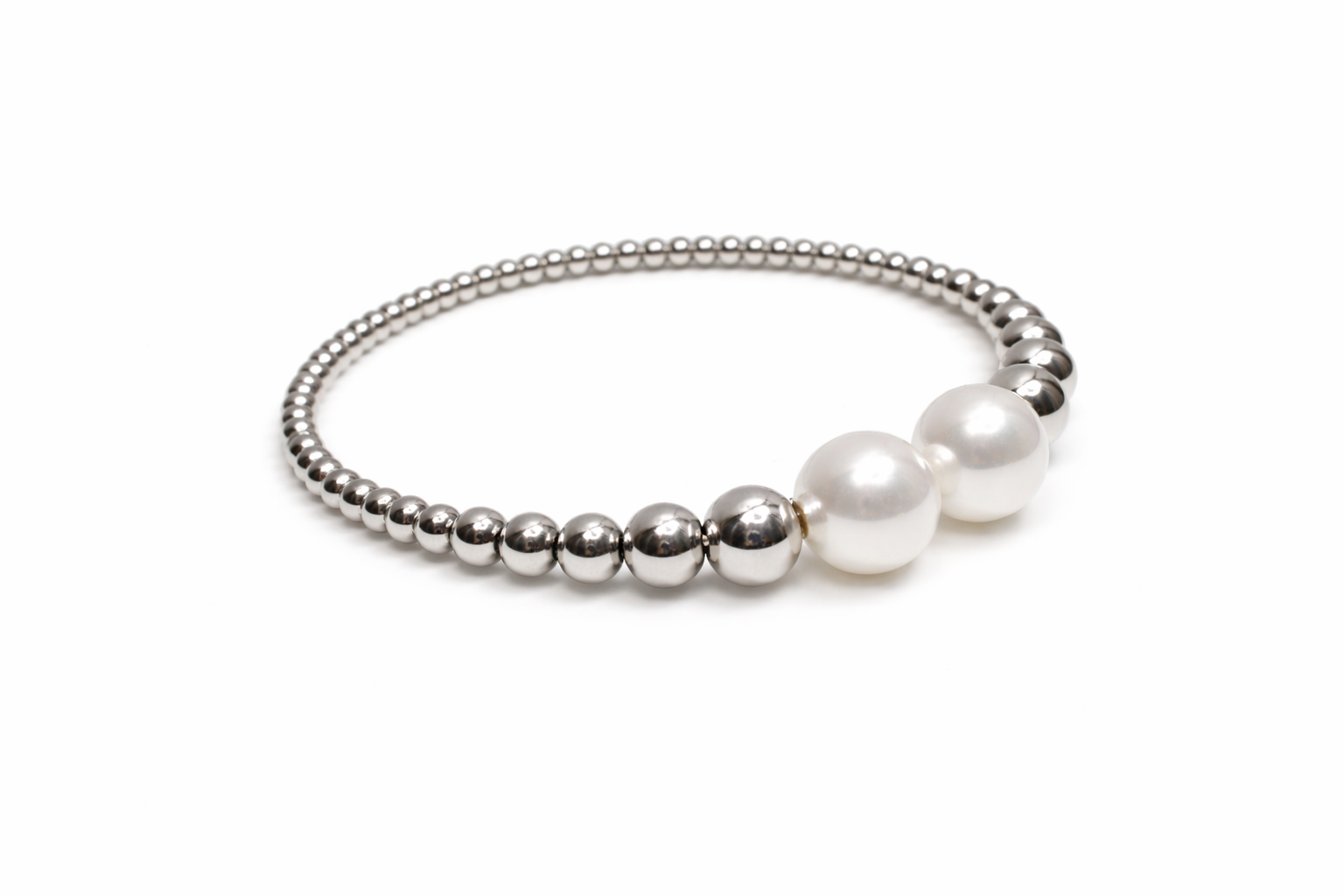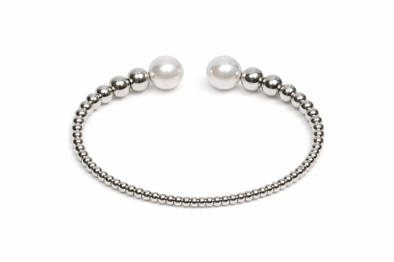 This beautifully crafted bracelet features a sleek and contemporary design, made with high-shine silver-tone beads arranged along a flexible wire for a comfortable, easy fit. Graduated bead sizing adds a subtle sense of movement and refinement, while two lustrous pearl accents create a soft, elegant focal point.
