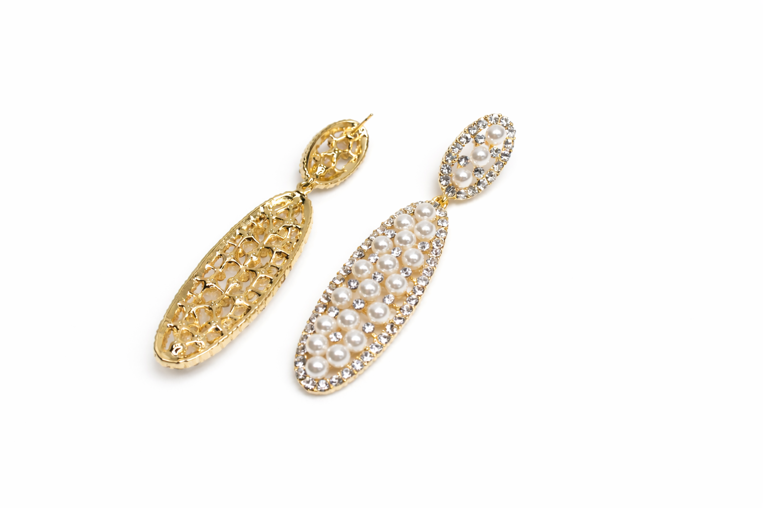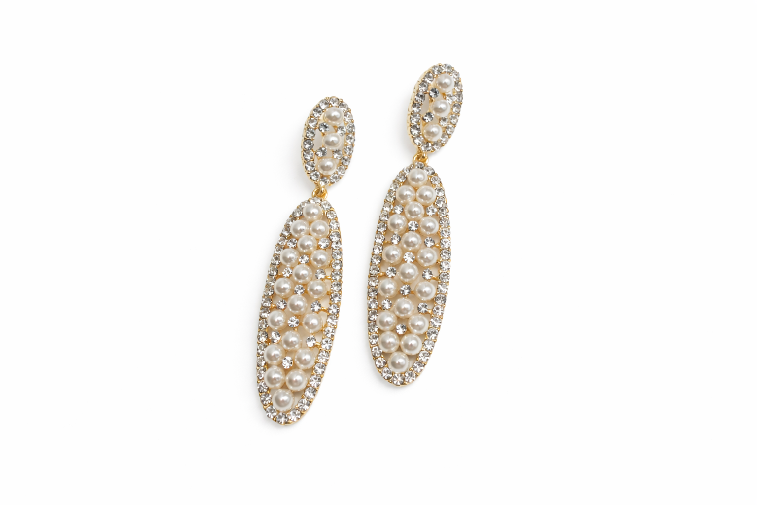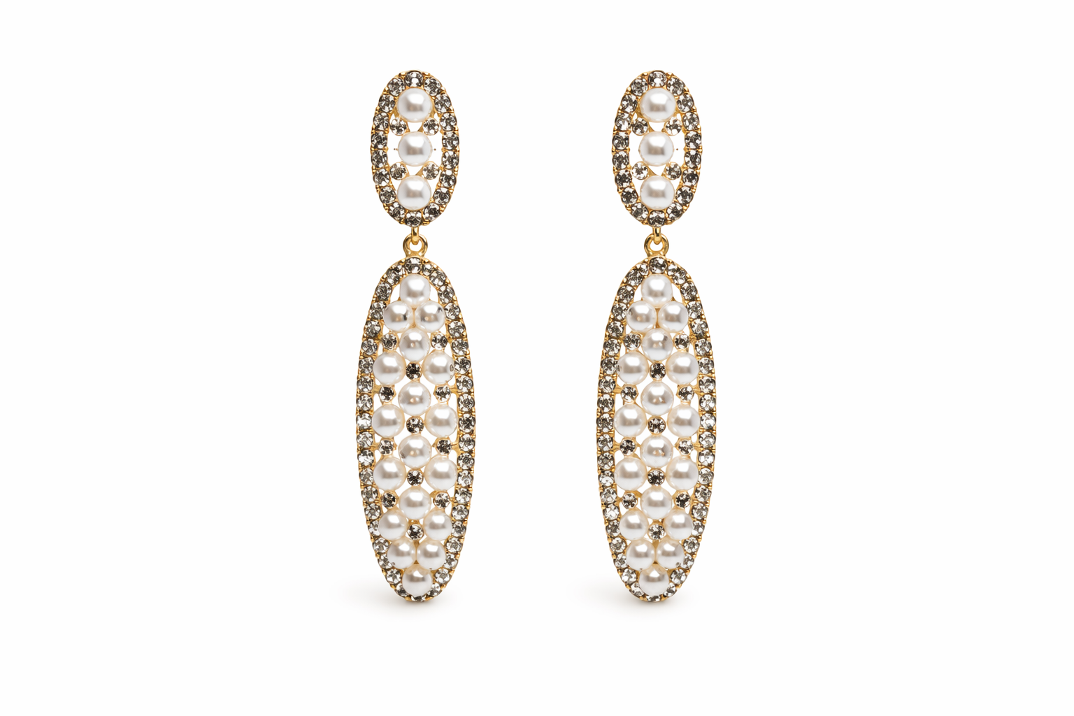 The top features a slightly oval-shaped stud, beautifully framed with sparkling clear stones and centred with a cluster of lustrous white pearls, creating a delicate yet eye-catching focal point. Suspended below is a longer, softly tapered oval drop, also adorned with a combination of radiant pearls and shimmering stones, arranged in a graceful, symmetrical pattern.