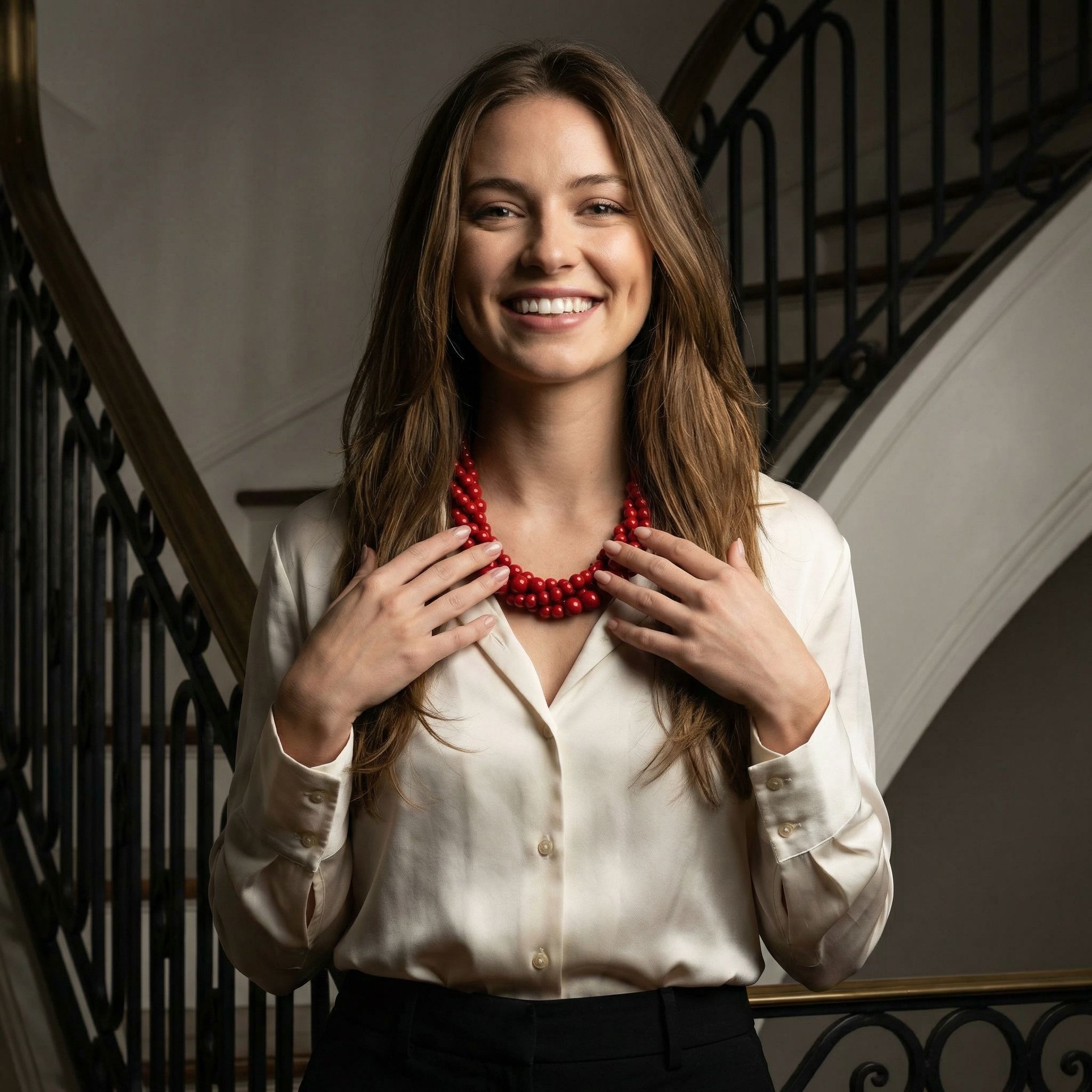 This striking multi-strand necklace is a bold and versatile statement piece, designed to elevate both day and evening looks.