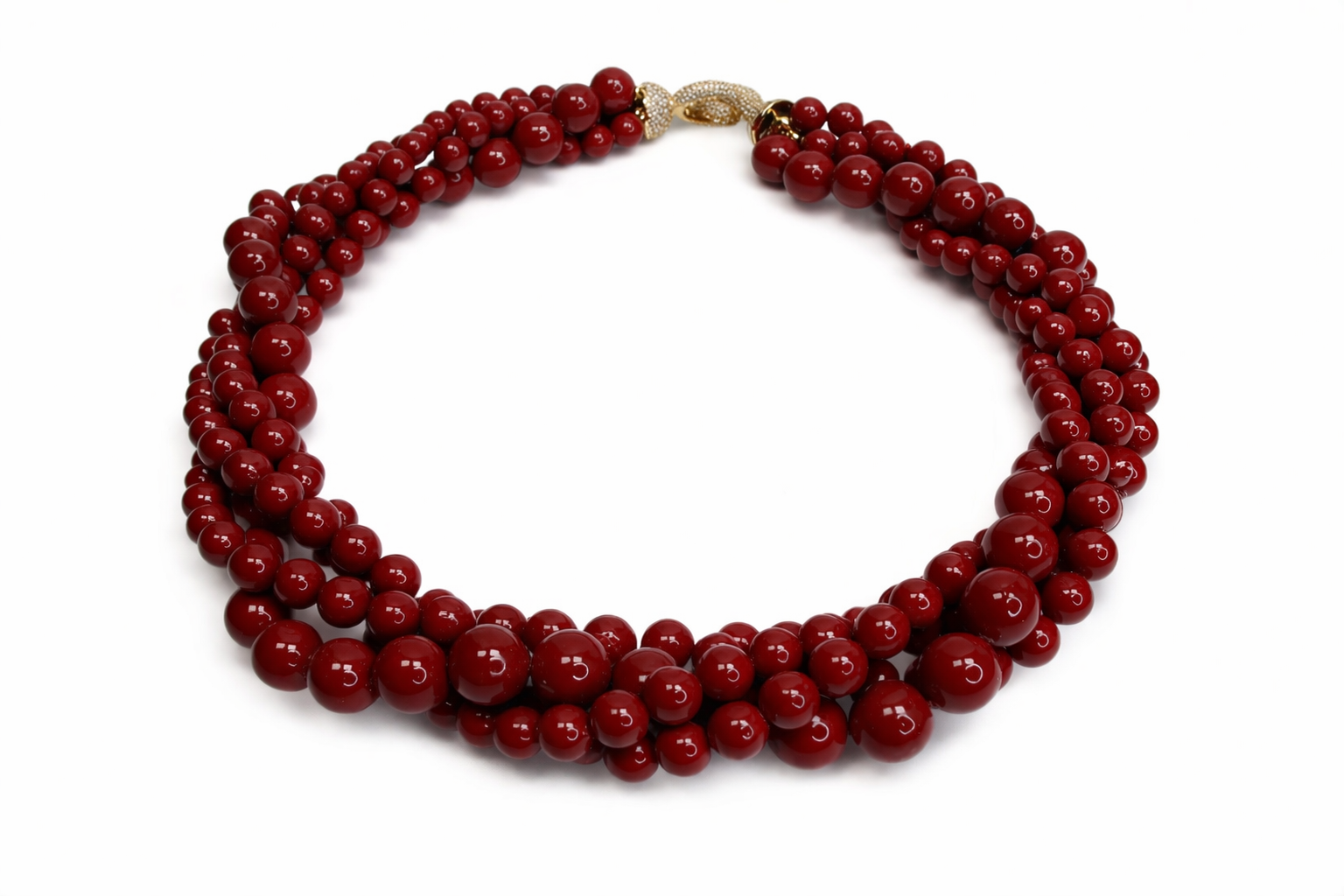 Crafted from lustrous deep burgundy-tone beads, the necklace features multiple strands of highly polished spheres in graduated sizes, creating a rich, dimensional texture. The deep gunmetal hue offers a sleek, modern alternative to classic pearls, with a mirror-like finish that catches the light beautifully.