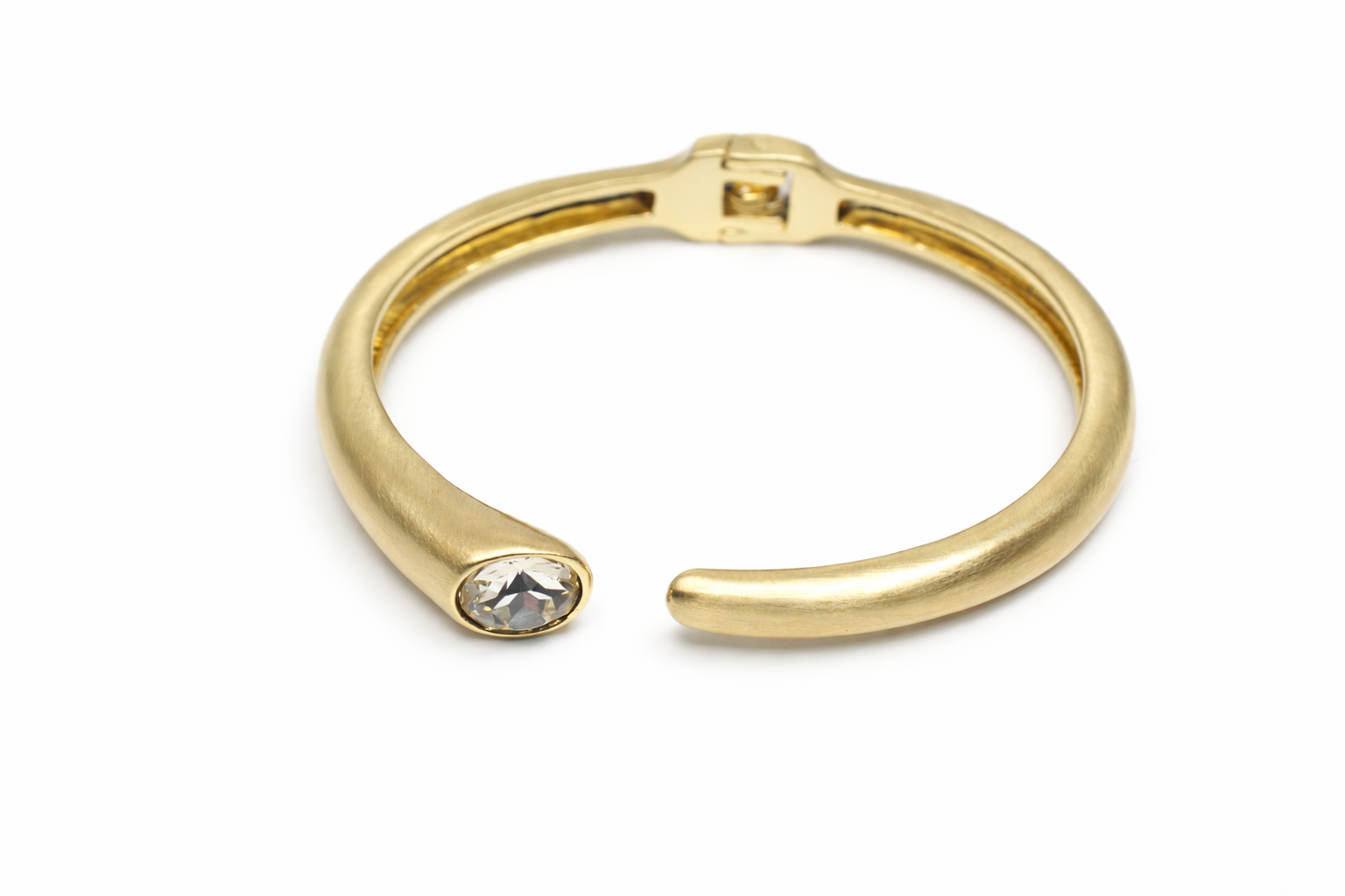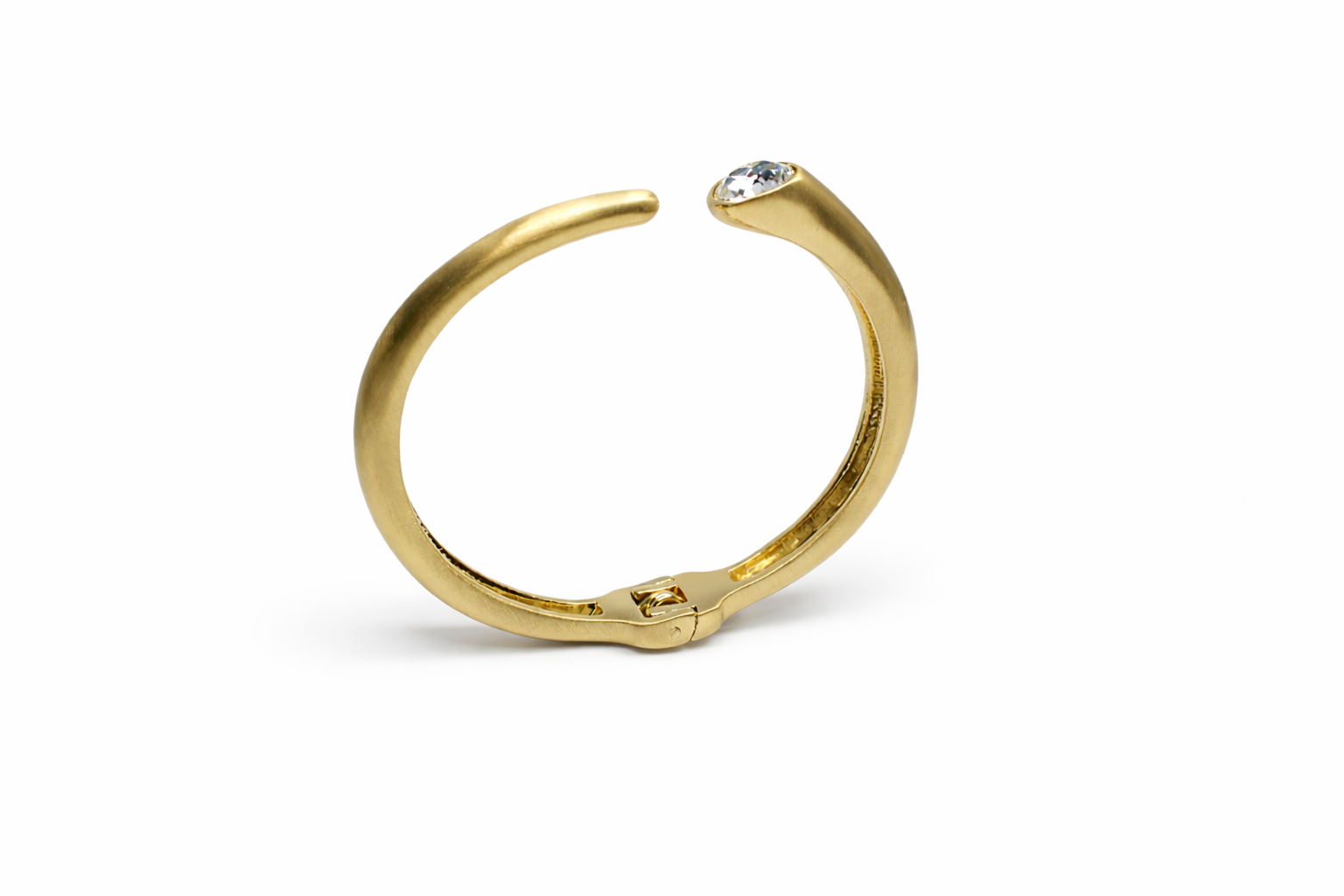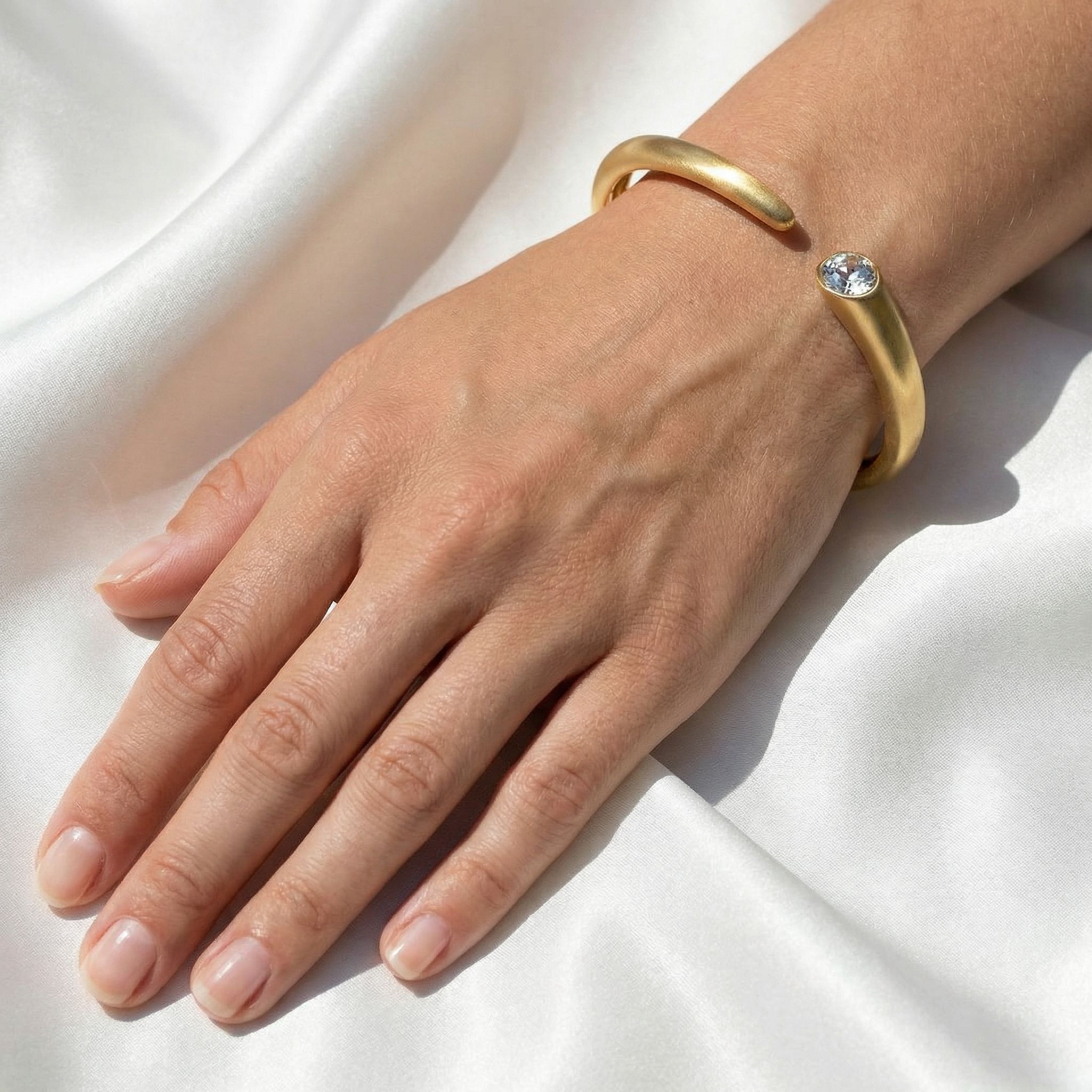At the front, the design is elevated by a single bezel-set clear stone, neatly embedded into one tapered end of the bangle. This subtle focal point catches the light delicately, providing just the right amount of sparkle without overpowering the minimalist design.
