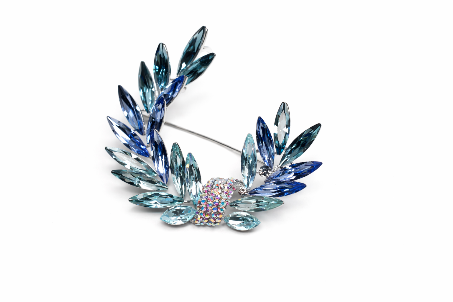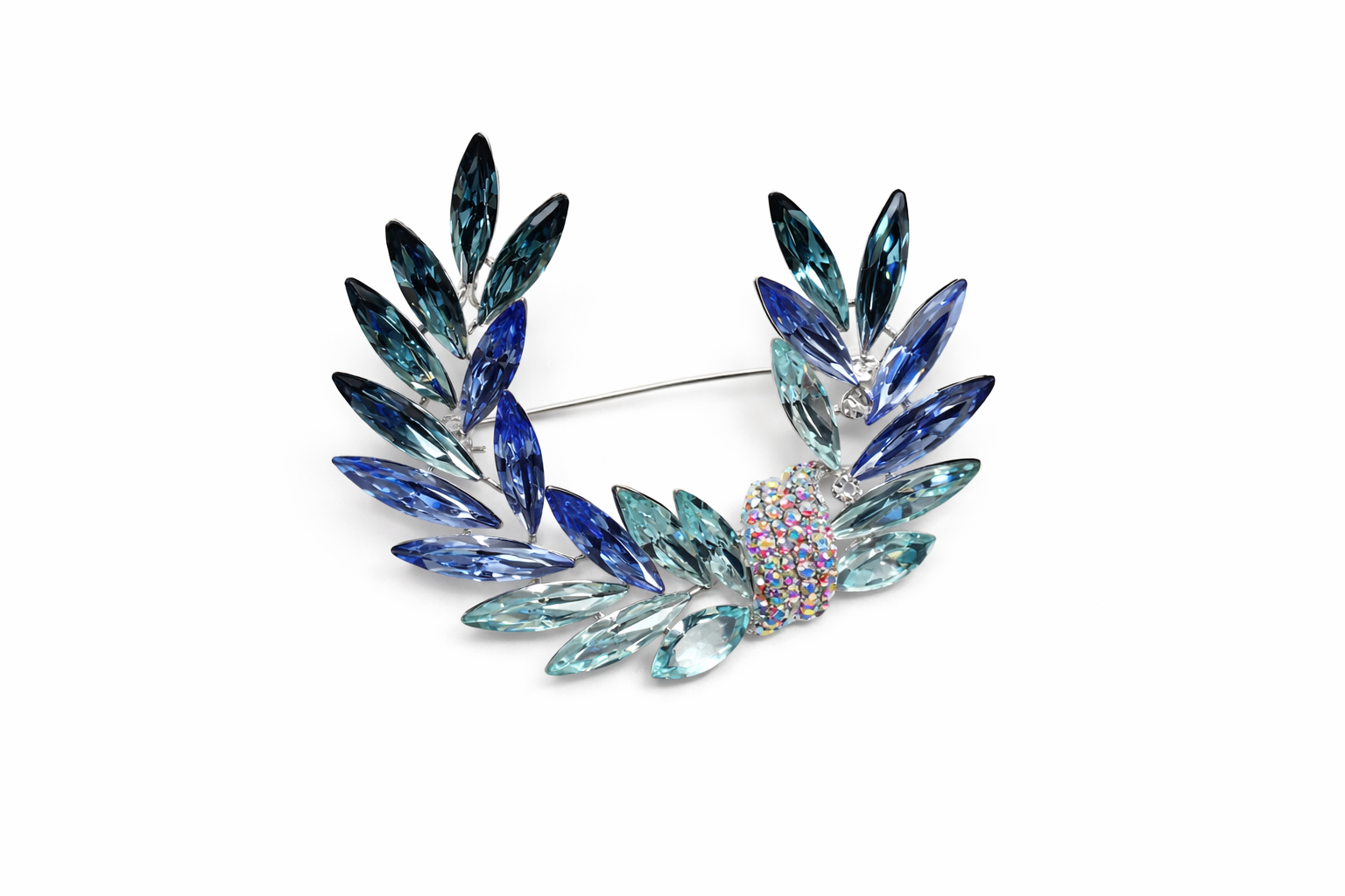 Crafted in a sleek silver-tone setting, the piece features marquise-cut crystals arranged like delicate leaves, forming an open circular shape. The stones graduate through stunning shades of deep navy, royal blue, and soft aqua, creating a fresh, fluid colour transition that catches the light from every angle.