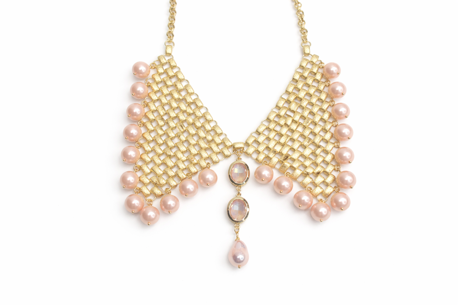At the centre, the necklace is accented with faceted oval stones in a subtle iridescent blush tone, leading down to a single drop pearl, which creates elegant movement and draws the eye.
