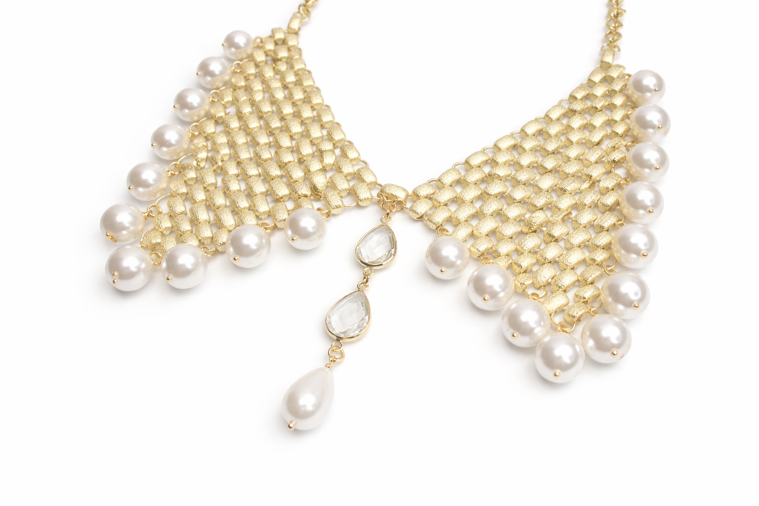 The piece features a richly textured gold-tone woven mesh, forming a distinctive V-shaped collar that drapes gracefully across the collarbone. Along the edges, lustrous white pearls are delicately suspended, adding softness and movement to the design. At the centre, a cascading drop detail showcases faceted teardrop crystals, finishing with a single pearl drop for an extra touch of refinement and fluidity.