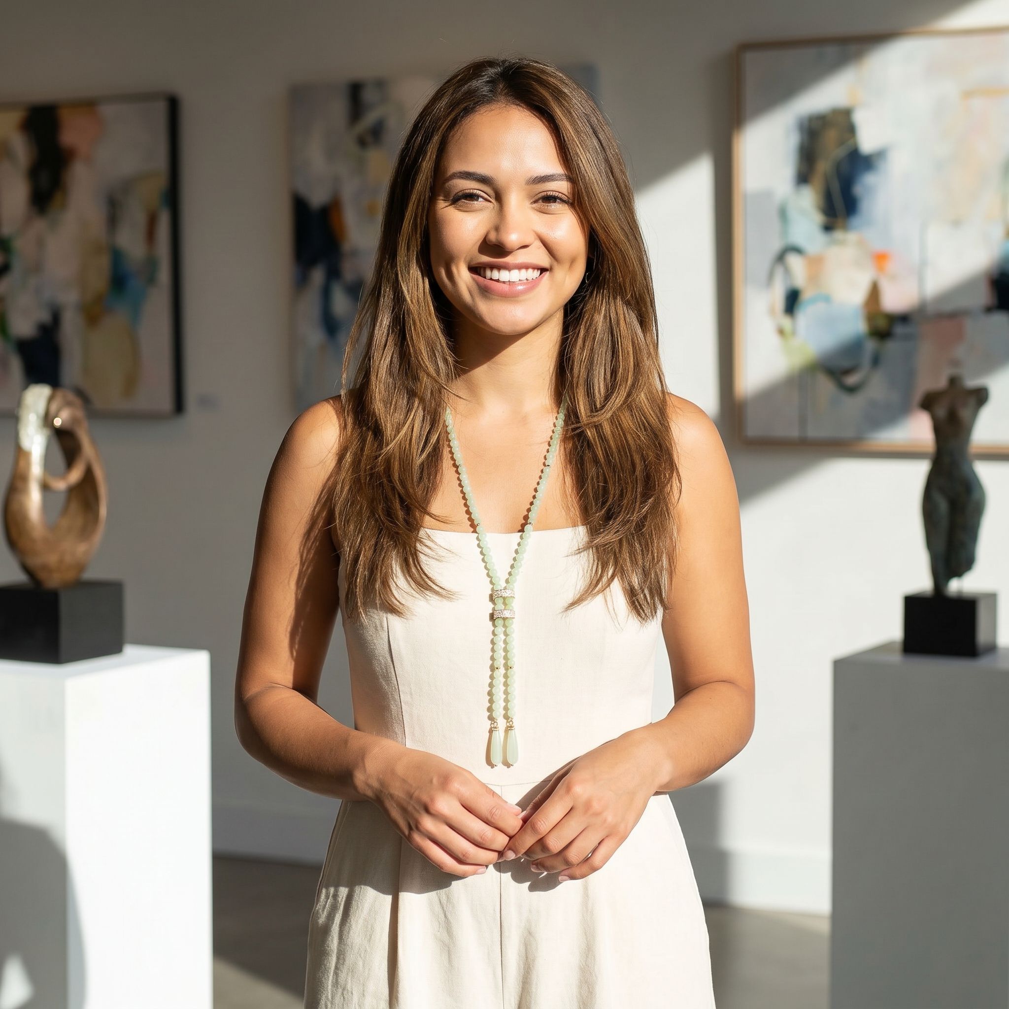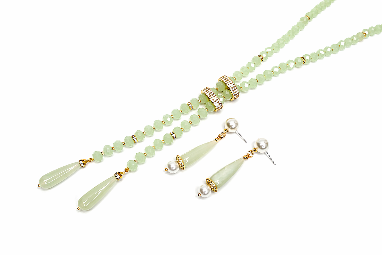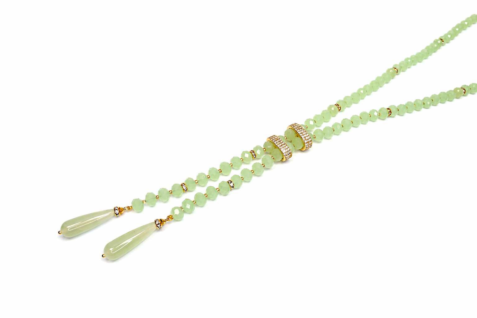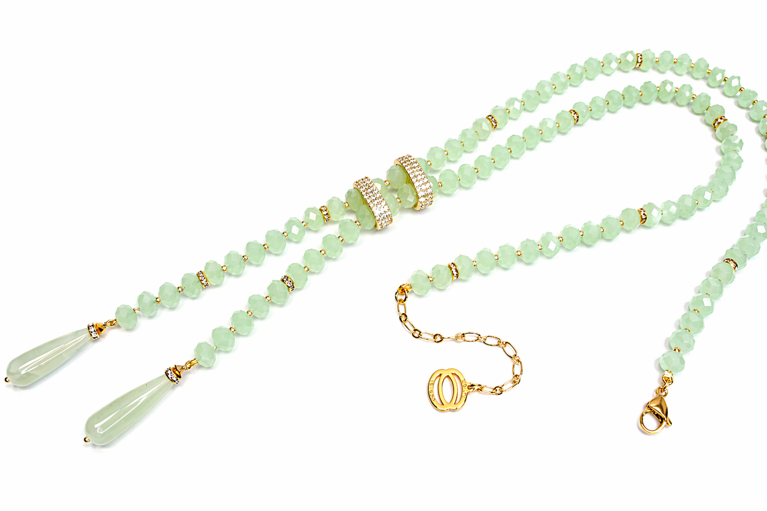 The necklace finishes with two elongated, smooth teardrop pendants in matching mint green, which hang gracefully and create movement and elegance.