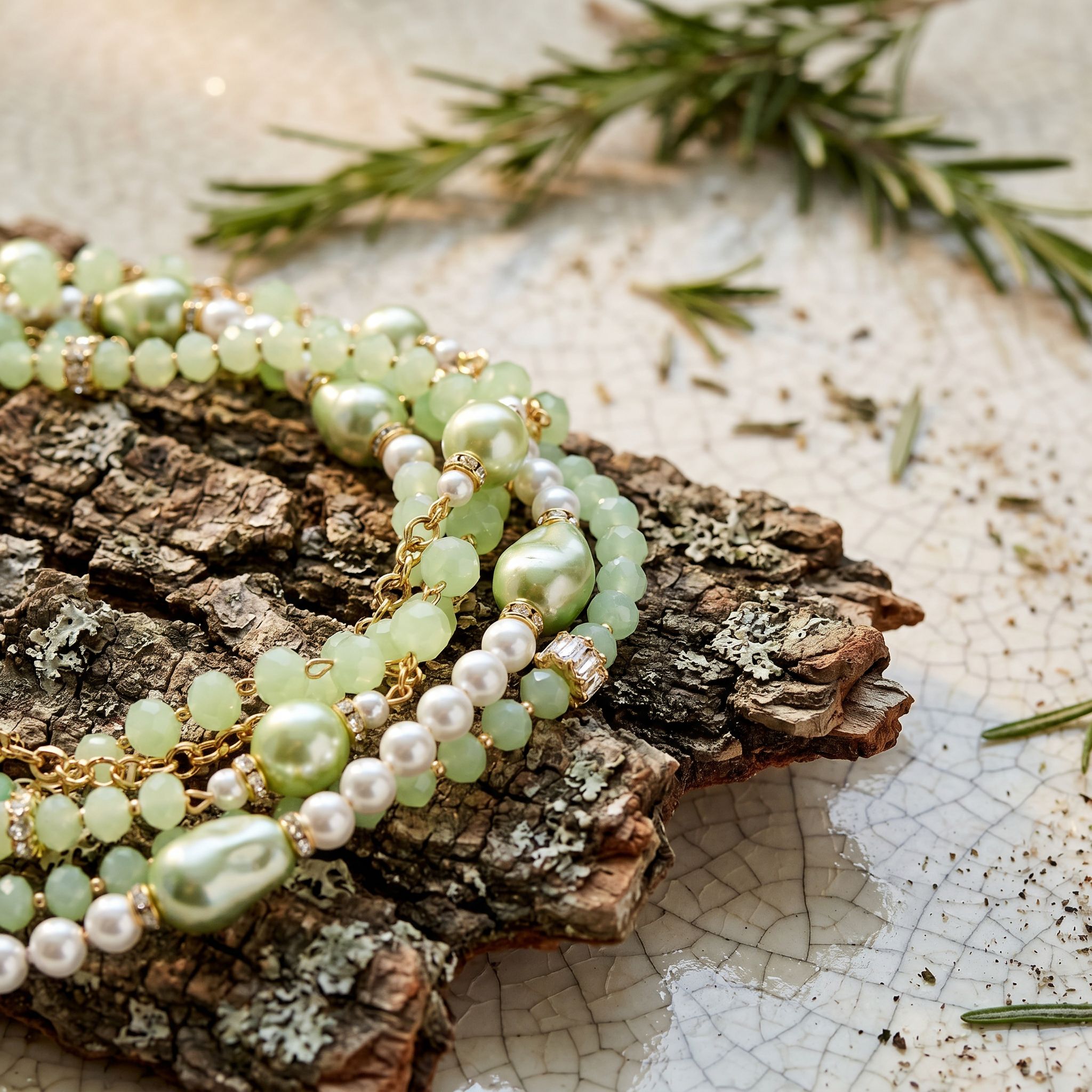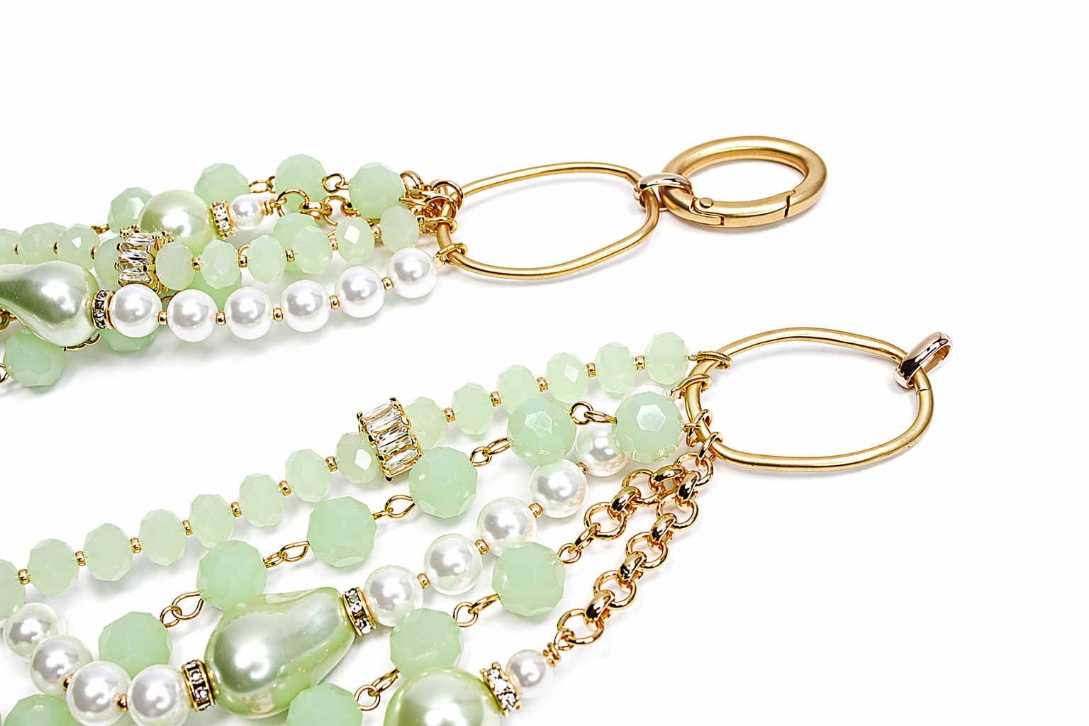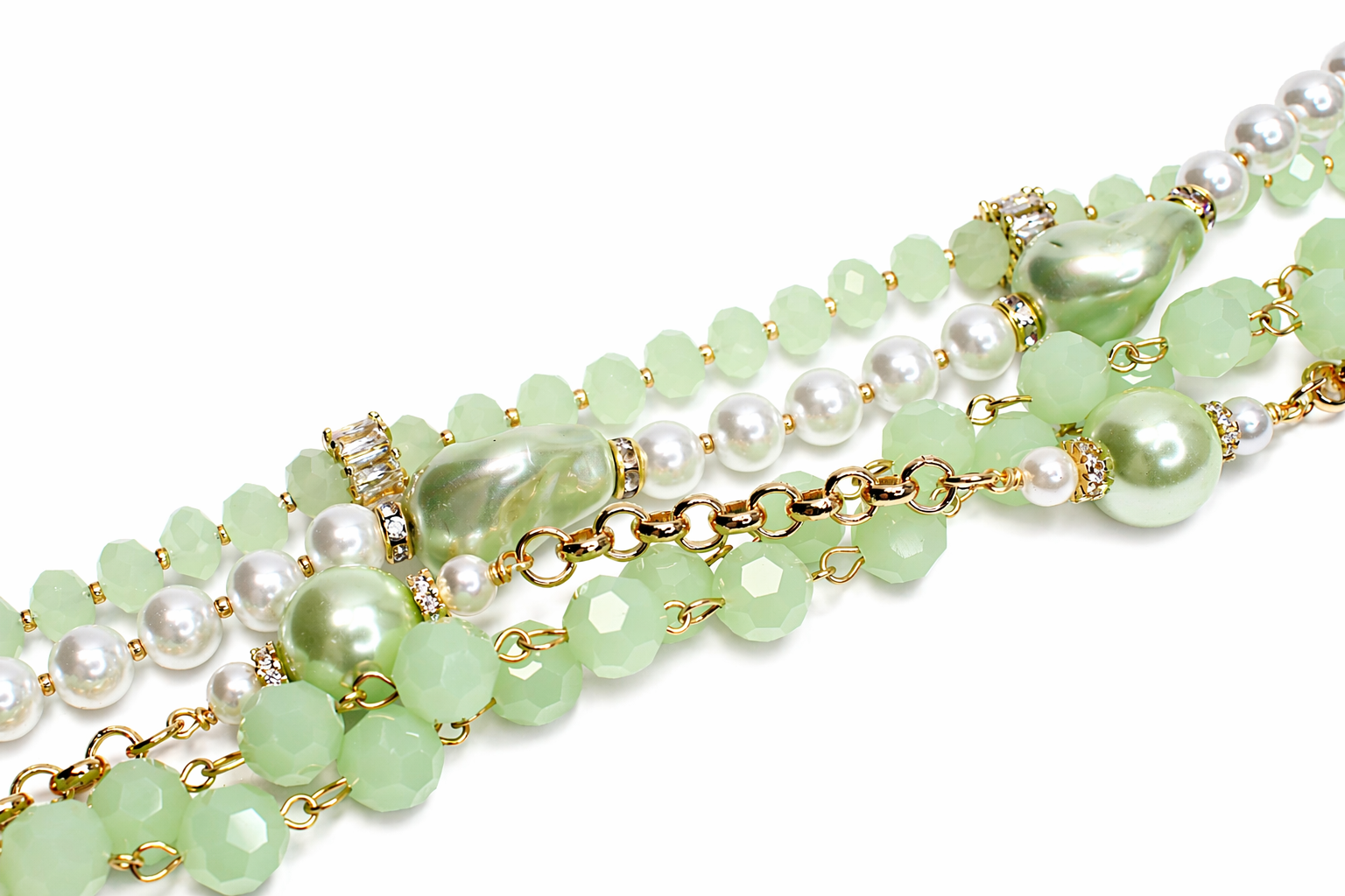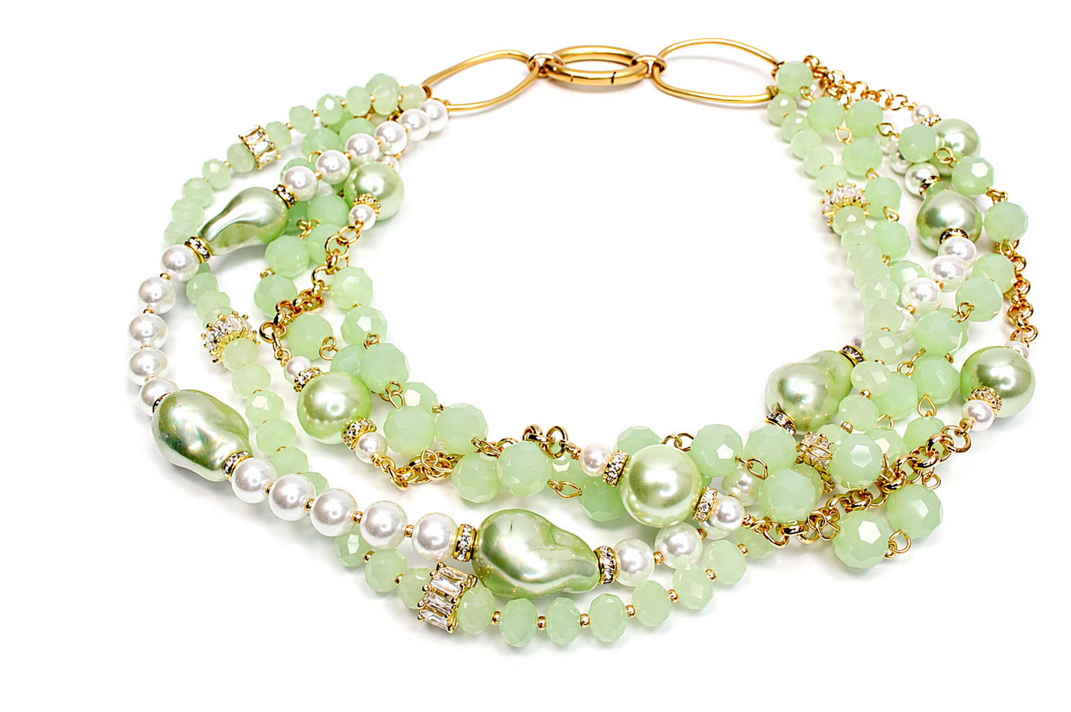 Throughout the design, larger baroque-style pearls in a matching green tint serve as eye-catching focal points, giving the piece an organic, high-end feel. Sparkling crystal-set spacers and gold-tone accents are thoughtfully placed along the strands, catching the light and enhancing the necklace’s overall brilliance.
