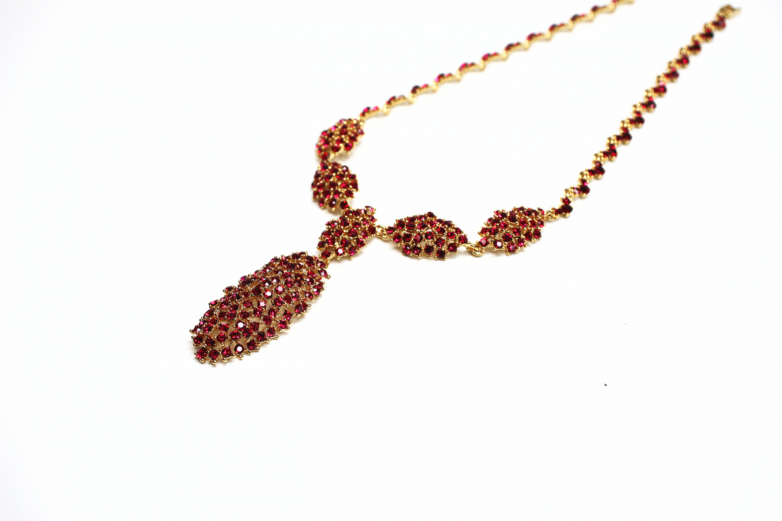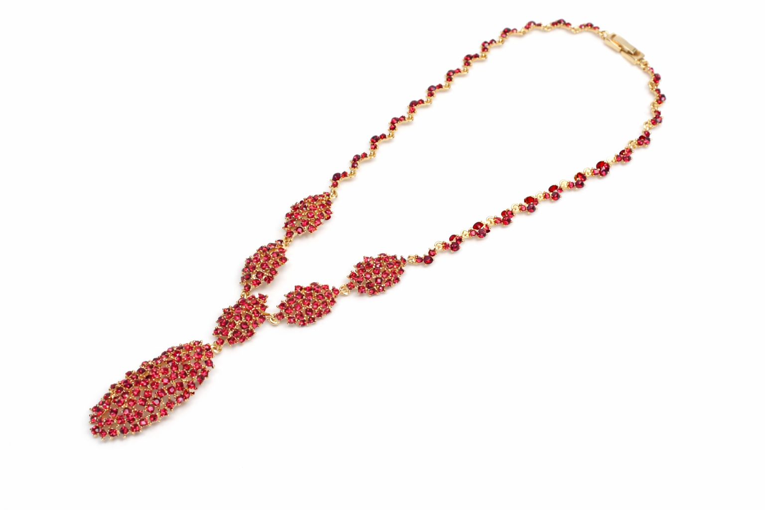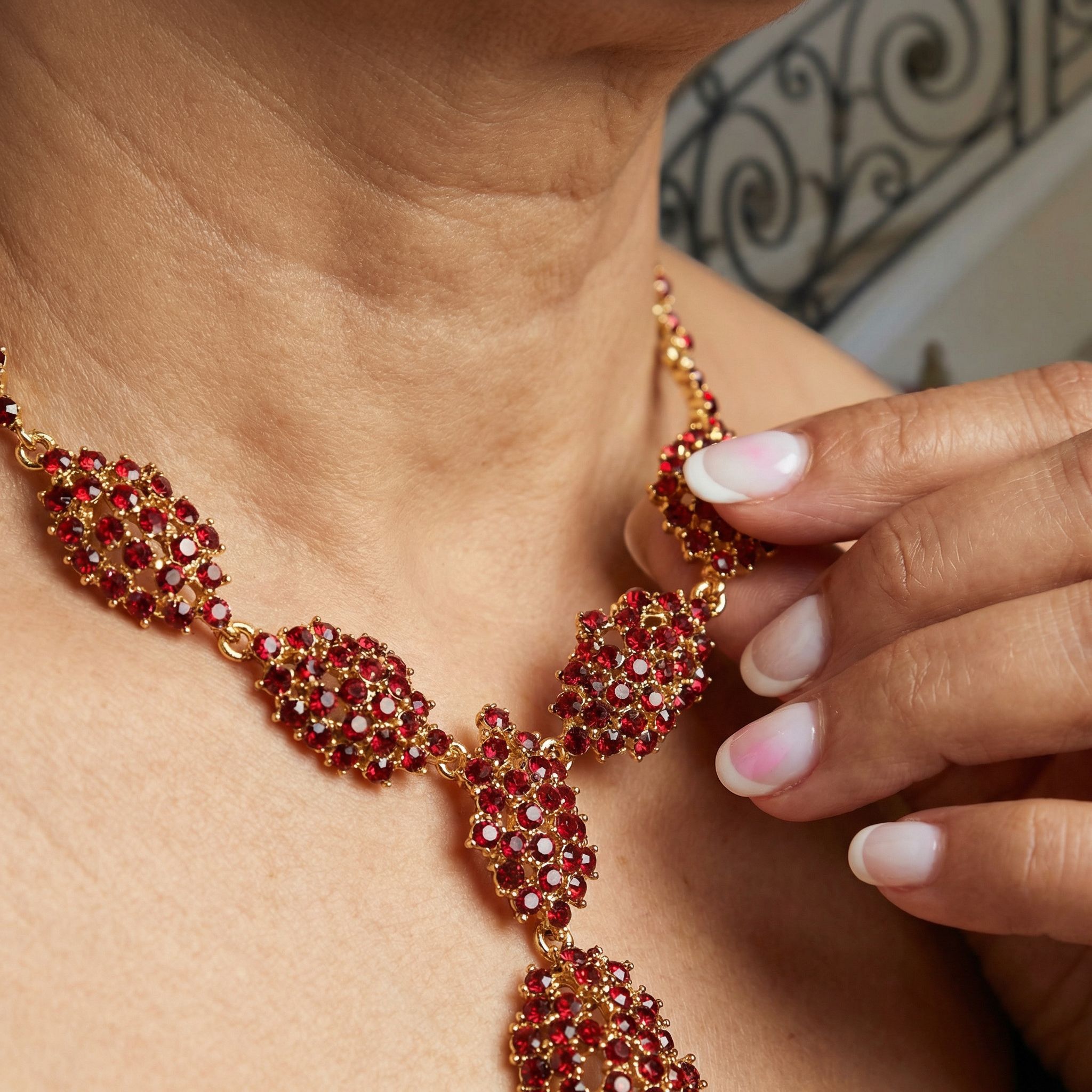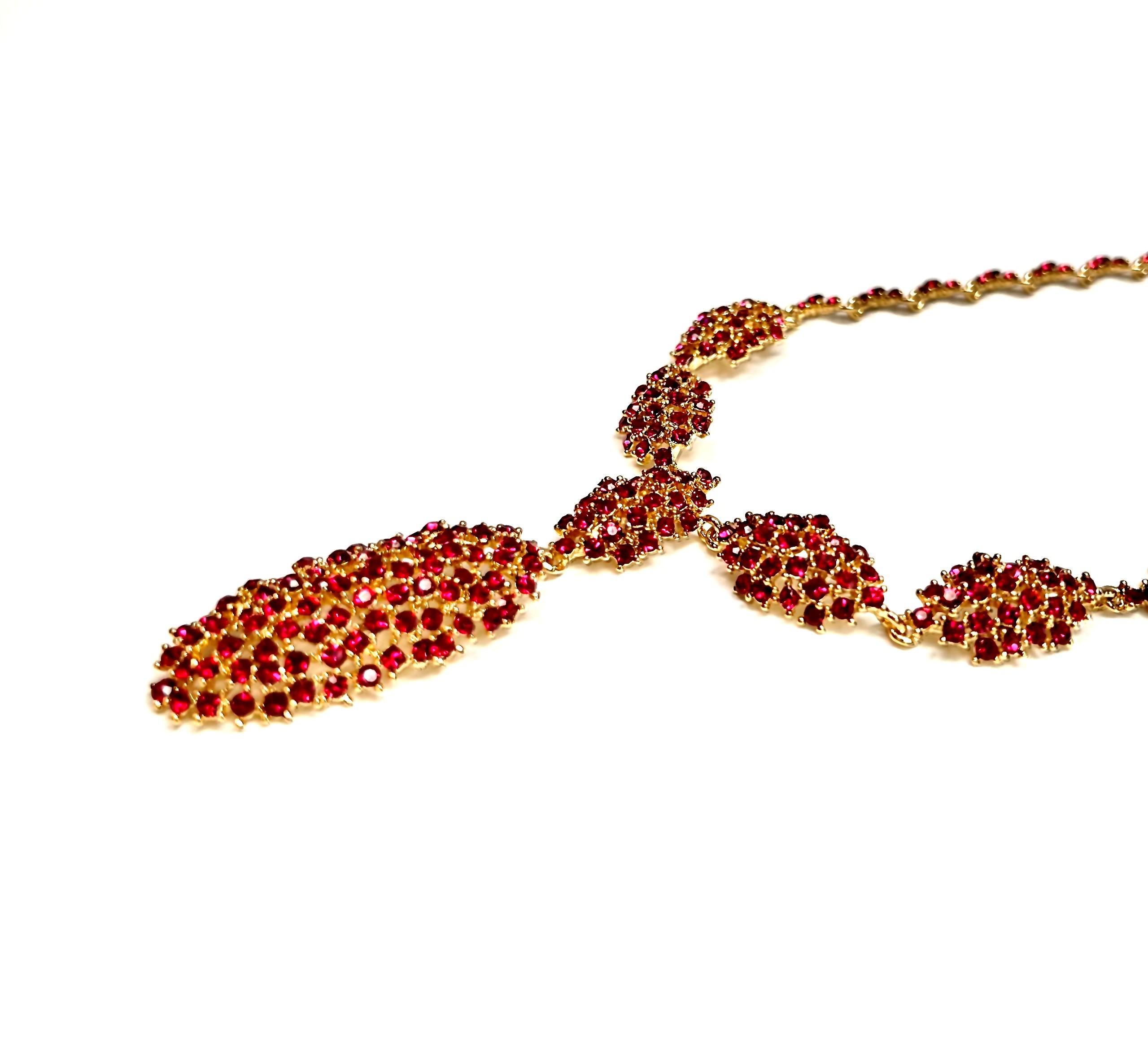 Elevate your look with this exquisite red crystal statement necklace, designed to bring elegance and glamour to any special occasion. Crafted with a radiant gold-tone setting, the necklace features delicate links adorned with sparkling red crystals that lead to beautifully detailed clustered motifs. At the centre, a stunning elongated drop pendant encrusted with shimmering red stones creates a captivating focal point.
