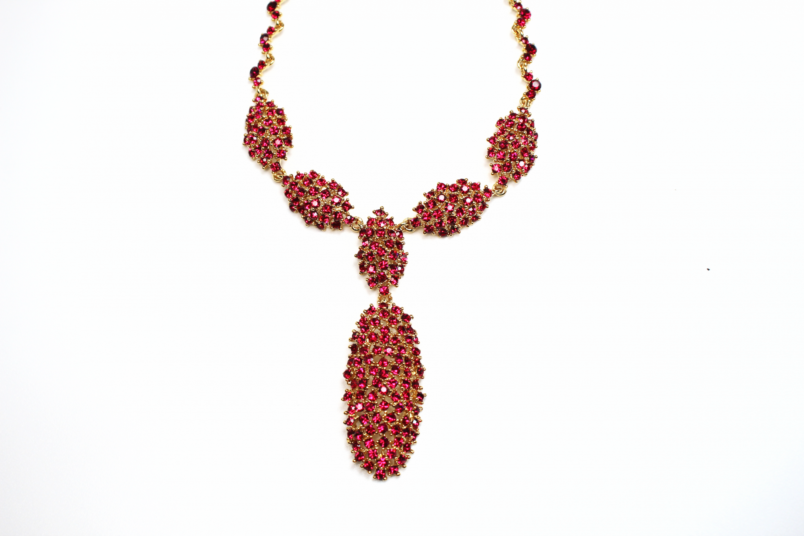 - Elegant statement gold tone necklace in red with a dramatic drop pendant